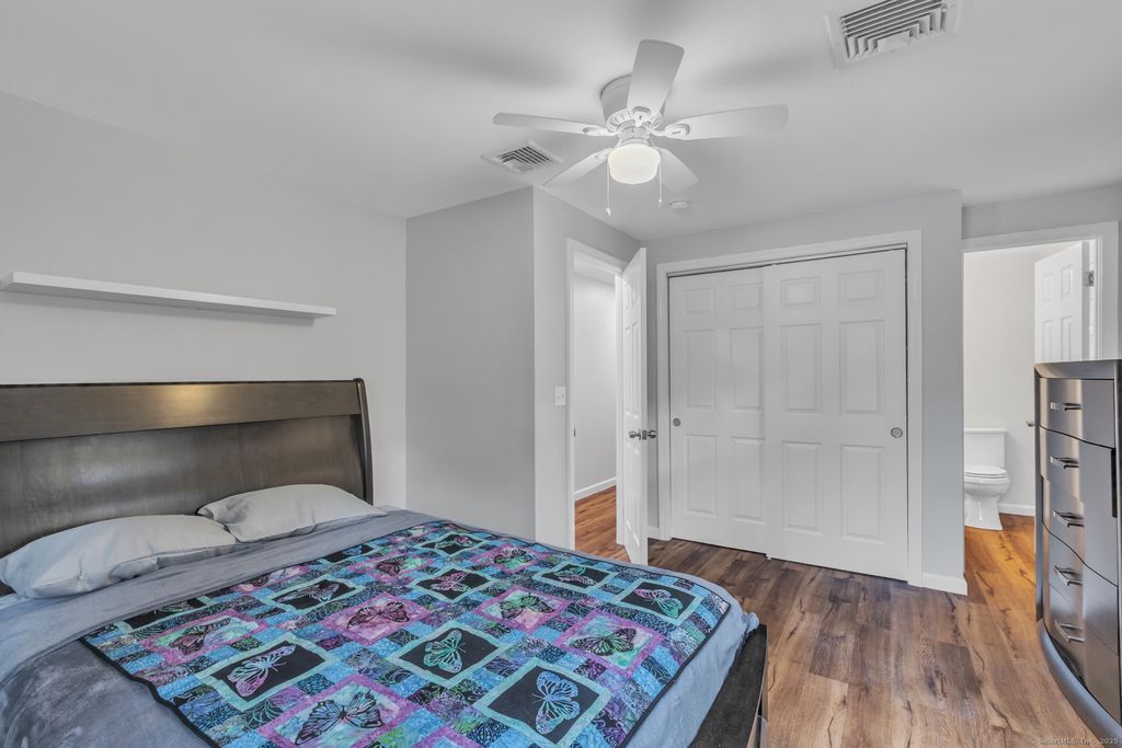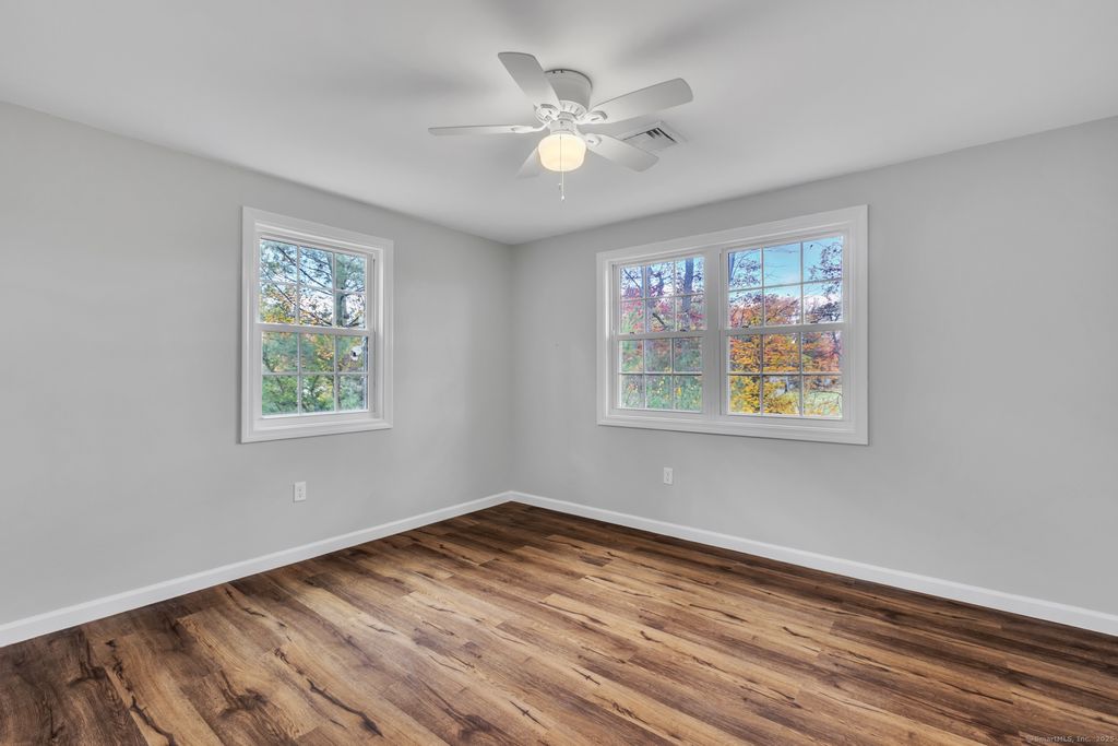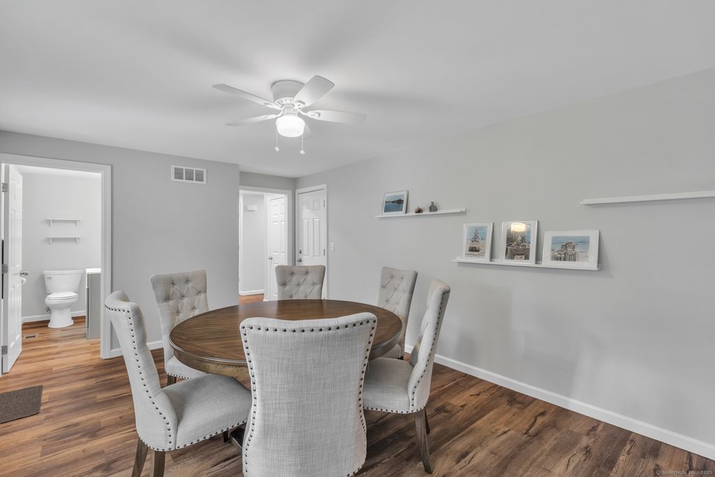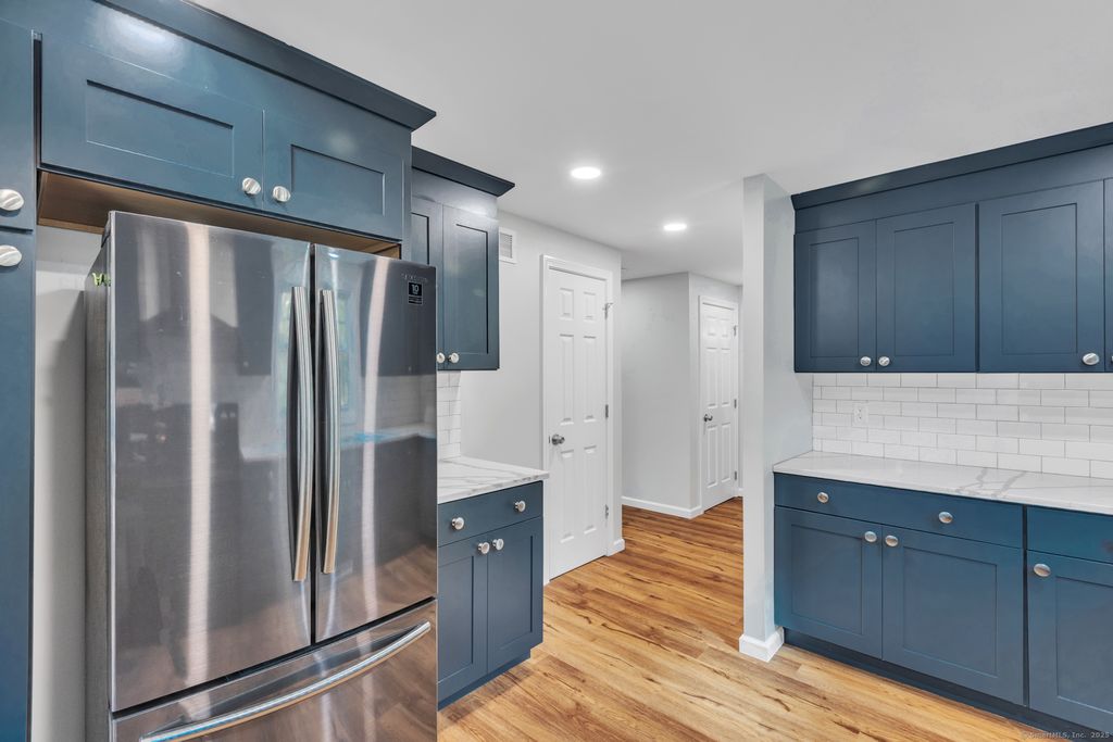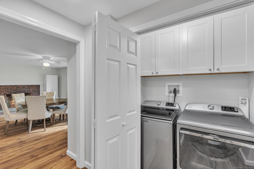 Completely renovated 1720 sq. ft. Colonial with tranquil views of rural Ellington farmlands. Situated on 0.69 acres, this home offers a new roof, siding, electrical, windows and doors, fresh paint, engineered hardwood floors, consistent 6-panel white doors, updated appliances and more. A double door transom window front entrance foyer leads to a front facing living room with oversized front window and French doors to an eat-in kitchen. The kitchen includes new cabinetry, new appliances, quartz counter tops, breakfast bar, tiled backsplashe, and abundant recessed lighting and cabinetry. The main level also includes a rear facing family room with wood-burning fireplace and backyard access, a first-floor laundry with new appliances, and a beautifully refinished full bath. The second story includes a primary bedroom with a renovated full bath, 2 additional bedrooms, and an impressive updated full common bath. The lower level is unfinished and ready for your imagination. Private south facing backyard, 1-car garage. New hatchway door 2025 and new septic tank in 2015!