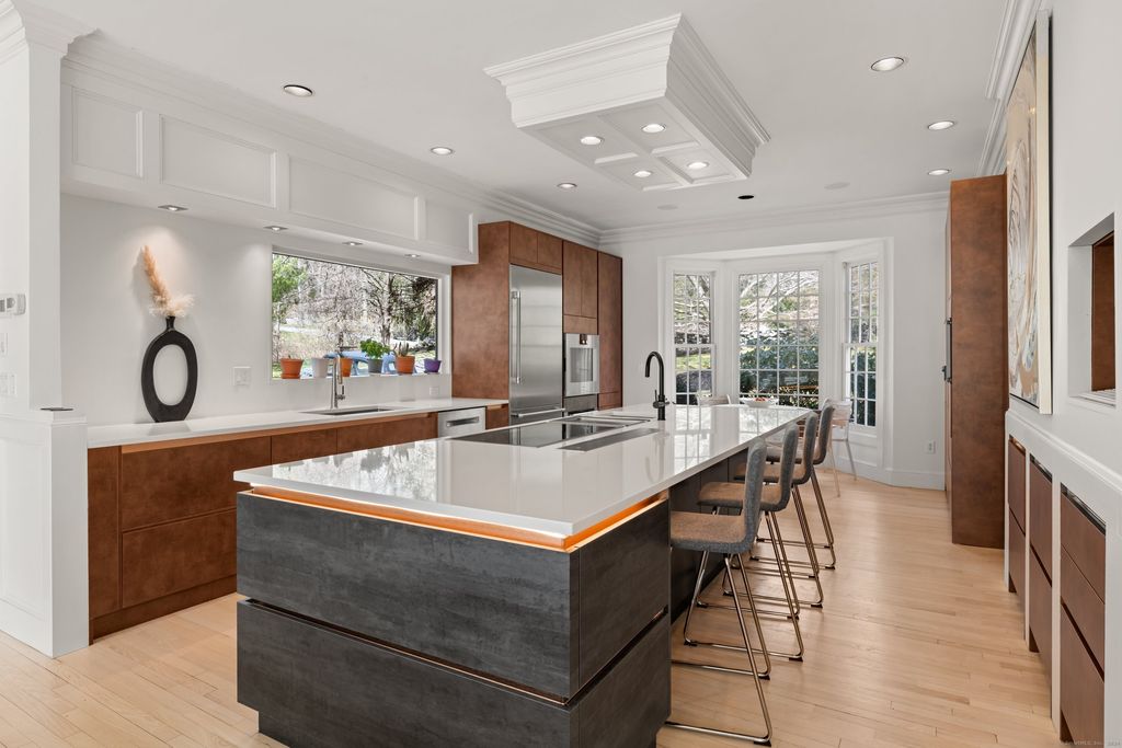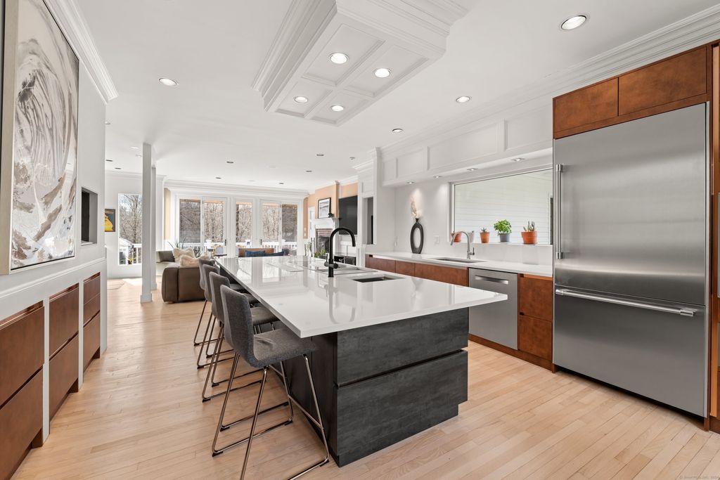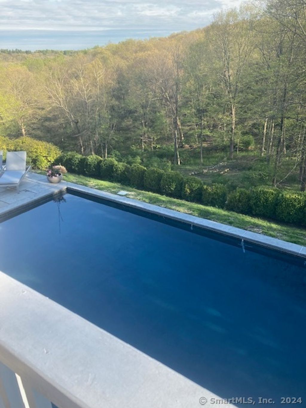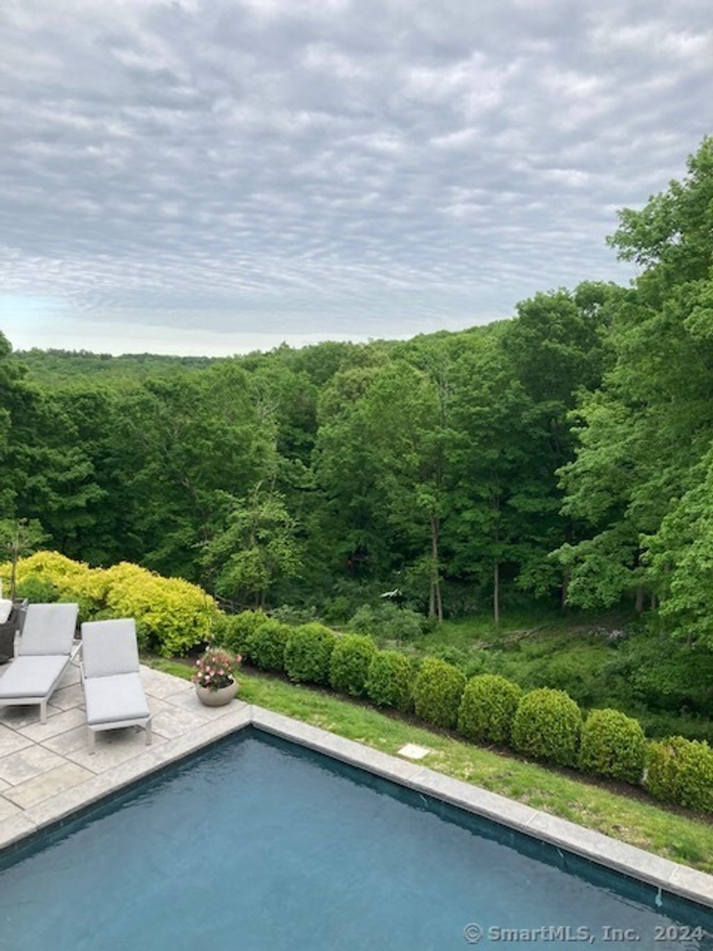 Stunning views, thoughtful upgrades, and exceptional privacy define this beautiful colonial set on 3.8 landscaped acres. A soaring, light-filled entry hall leads to elegant living spaces with refinished hardwood floors, high ceilings, and detailed moldings. The living room with fireplace, an oak-paneled library, and formal dining room offer timeless charm. The custom chef's kitchen features top-of-the-line Gaggenau, Thermador, Miele, and Bosch appliances, including induction cooktop, steam oven, built-in Teppanyaki grill, espresso machine, and wine cooler. The adjoining family room boasts oversized windows, French doors to a mahogany deck, wood-burning fireplace, and full bar - perfect for entertaining. Upstairs provides four bedrooms including a primary suite with his-and-her baths and expansive property views. A bonus room above the garage offers flexible space for work or play. The walkout lower level includes a gym, full bath, and changing room. Outside, enjoy a heated gunite pool, outdoor shower, and stone patio surrounded by mature landscaping and stone walls. Energy-efficient features include Tesla solar panels with two backup batteries and an EV charging station. Convenient to local trails, Woodcock Nature Center, Weir Farm, and shopping in Ridgefield, Georgetown, and Weston. This defines refined country living -elegant, efficient, and effortlessly private.