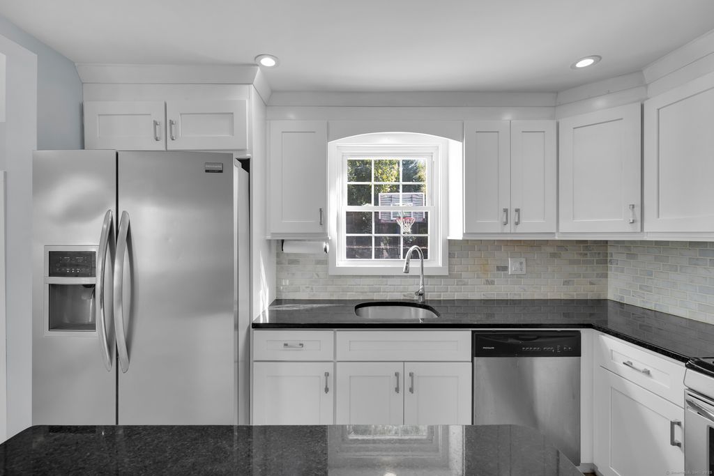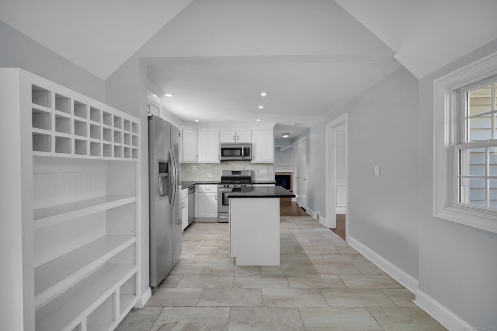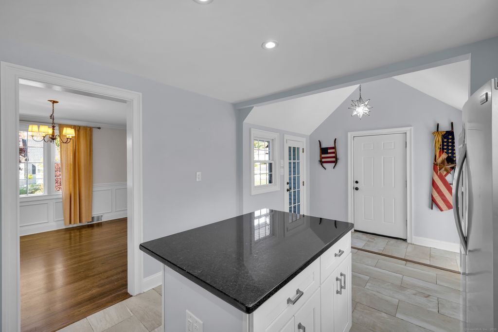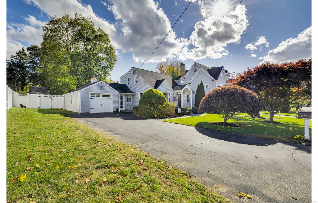 Discover this charming Cape full of character, ideally located on a quiet side street in the heart of Fairfield. A white picket fence and updated portico create storybook curb appeal that continues inside. The spacious living room centers around a fireplace and flows to a dining room with crown molding and a beautiful kitchen featuring black granite countertops, stainless steel appliances, a center island and a cathedral ceiling with exposed beams. Off the kitchen is a third bedroom or office with french doors leading to the fenced-in yard. Upstairs offers a primary bedroom, hall bath and second bedroom with hardwood floors throughout. The finished lower level adds living space plus a separate laundry and utility room. An additional space was created off of the garage for pets but can be used for storage. Enjoy secluded outdoor living with planters atop a stone wall and an extended bluestone patio.