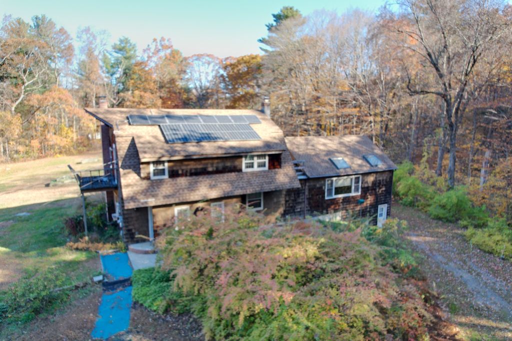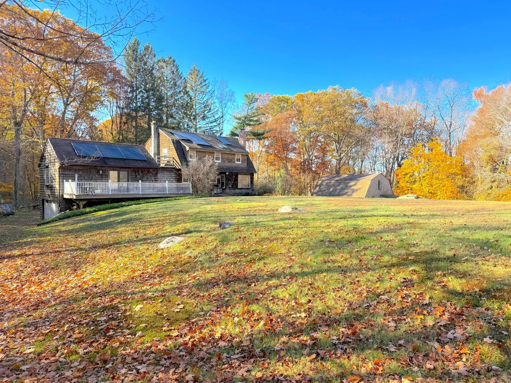 Tucked away at the end of a quiet country lane shared with only a few other homes, this charming property offers peace, privacy, and a beautiful natural setting. The main level features a formal living room, dining room, kitchen, and a convenient half bath. A spacious family room with a wet bar and pellet stove provides the perfect gathering space, with French doors leading to a private deck overlooking the expansive, park-like grounds. Upstairs, you'll find three bedrooms, an open office area, and a full bath. Additional highlights include a two-car garage under the home and a large barn with garage space-ideal for vehicles, equipment, or potential use for horses and other livestock. Set on 4 scenic acres, this property blends country living with comfort and functionality. Leased solar panels at just $99/month help offset electric costs and add to the home's efficiency.