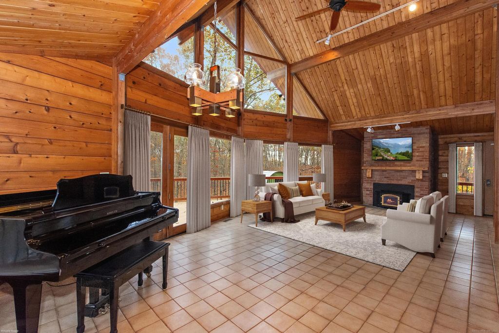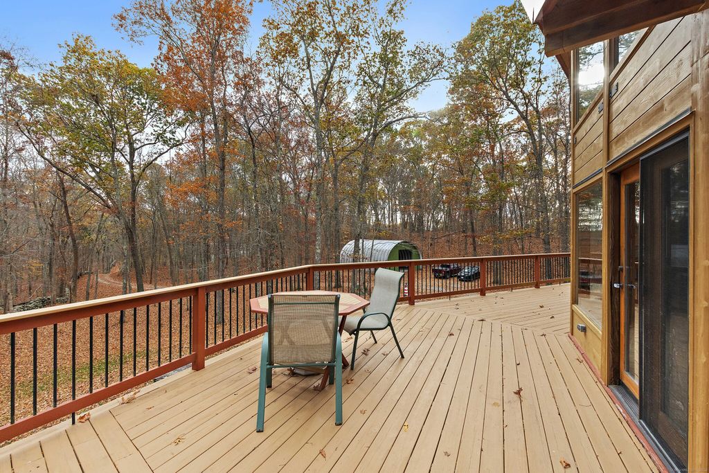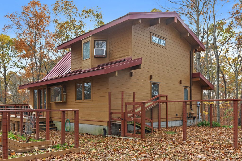 Tranquility awaits with this contemporary post & beam nestled on 4.25 private acres. Amazing outdoor views with soaring cathedral ceilings and walls of glass that connect you with nature while sitting in front of the fireplace. The main living space is open and has 2 bedrooms and full bath, the primary suite is on the upper level providing gorgeous views. The versatile lower-level room provides options for a bedroom, office, or playroom. Exterior highlights include a durable metal roof, expansive wraparound deck, and a fenced area perfect for pets or play. The property is designed for both comfort and lifestyle-featuring raised garden beds, a chicken coop (with chickens, if desired), and a huge metal garage/workshop with endless potential. Set on 4.25 private acres, this home offers the rare combination of privacy, functionality, and natural beauty-an ideal retreat with space to live, work, and play. Bordering protected land, great for walking trails, this property is more than a home-it's a retreat! Whether you're sipping coffee on the deck at sunrise, tending to your garden, or working on projects in the oversized garage, every detail is designed to enhance your connection to nature and provide space for the life you want to create.