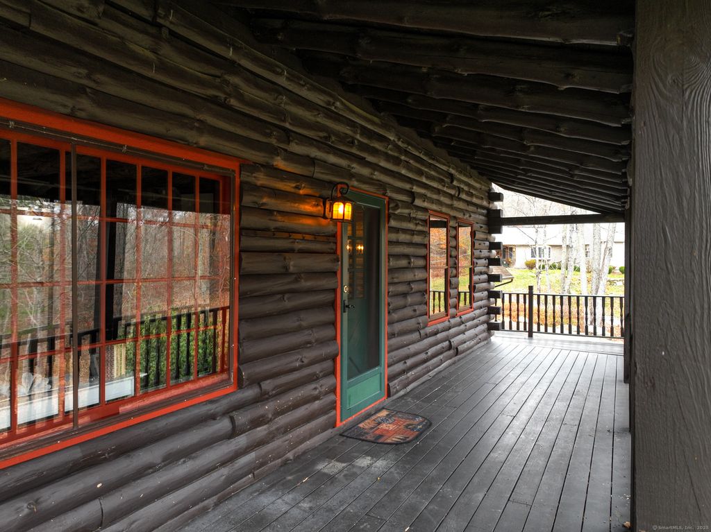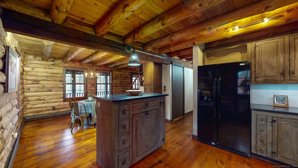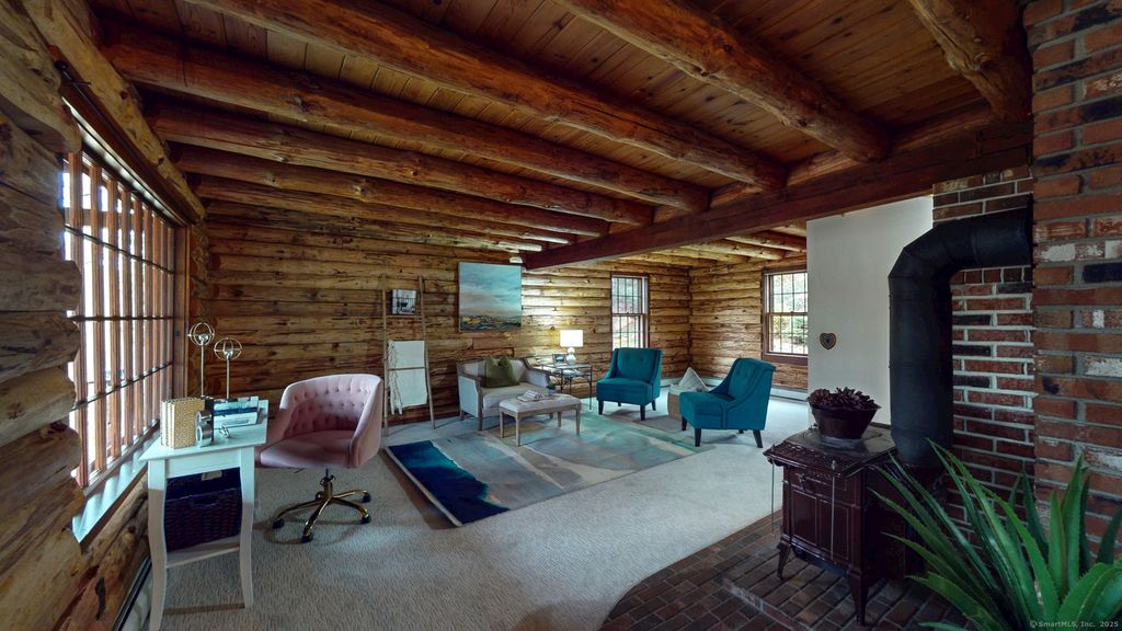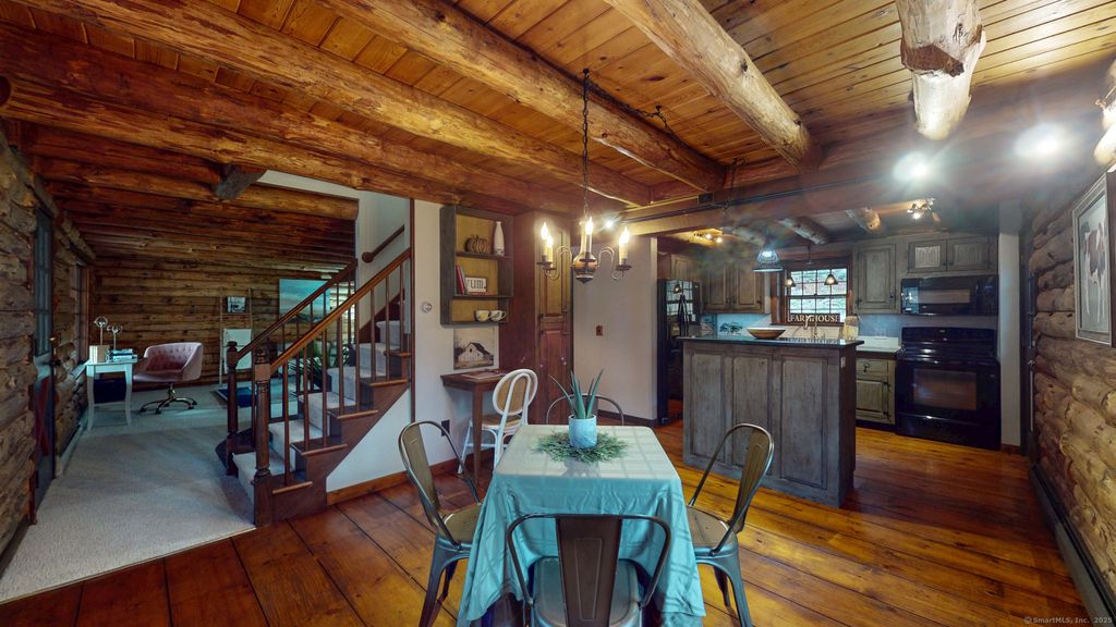 This charming center chimney Log Cape will warm your heart with rustic appeal and the smell of pine! Surrounded by a natural landscape, this one owner home proudly offers wide board pine floors, pine ceilings with exposed beams and an open floor plan with a welcoming front rocking porch! Custom cabinetry enhances the country kitchen and offers a center island plus dining area seating, granite counters and a farm sink. The Great Room features an inlaid brick hearth with VT Castings Defiant Encore woodstove and new Berber carpeting. Upstairs you'll find three spacious bedrooms with character - vaulted pine ceilings, ample closets, new carpeting and a second full bath. The lower level features a heated recreation room, utility and storage space, plus a convenient home office space. The post and beam garage offers a full walk-up loft for hobbyists or additional storage. This well- maintained home is conveniently located close to stores, schools and highway access, yet tucked away with forest views on a quiet road only minutes walking trails.