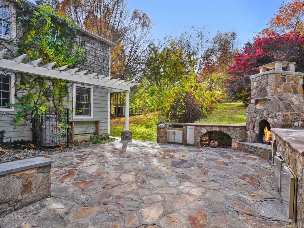 Storybook cape set on lovely oversized 1.81 acre parcel in an ideal Lower Easton location. Drive up the sweeping Belgian block-lined driveway past beautiful stone-edged beds to this very special retreat. Endless stone walls, bluestone, and masonry welcome you to this rustic elegant forever home. Make your way up the pristine stone stairs to the covered wrap-around mahogany front porch with its beadboard ceiling and timeless columns. Spend hours overlooking the Snoopy-style dog house, custom fire pit, swing set, shed, fenced-in garden area and amazing barn/workshop. Step into the open concept living room where light streams in through the many windows and the French door. Cozy up by the fireplace and sit by the stone hearth. The living room opens beautifully onto the sunny dining room and gourmet eat-in kitchen with its ss appliances and granite tops. From the kitchen/breakfast area step outside and enjoy gatherings by the amazing outdoor kitchen with its massive stone hearth. Back inside, tucked in a quiet corner of the main level, is a spacious bedroom/office with access to the first floor bathroom. Upstairs retreat to the oversized primary suite with 3 good-sized closets, a spa-like bathroom, and its own private balcony. The 3rd bedroom enjoys a vaulted ceiling, wall of built-ins, an ample closet, and its own updated full bath. The finished basement boasts a spacious playroom/office, laundry room, mudroom, and access to the 2-car garage.