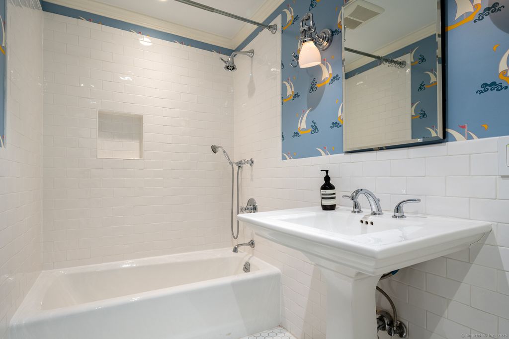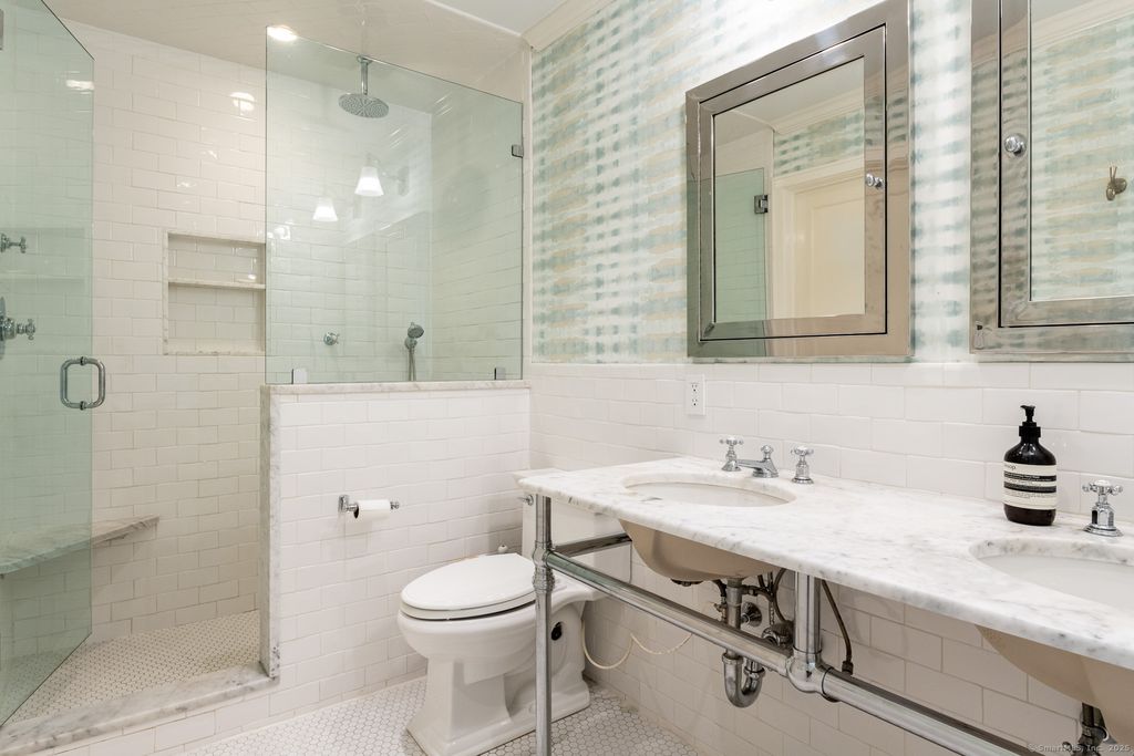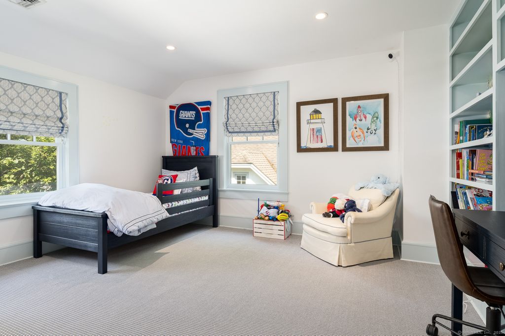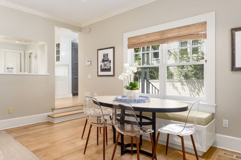 Perfectly positioned between conservation land and one of Greenwich's most prestigious roads, this five-bedroom home combines exceptional convenience with refined privacy. A tree-lined sidewalk provides direct access to downtown, while the property offers a serene, retreat-like setting. French doors open to a spacious terrace with outdoor lighting and a fully fenced yard, adjacent to an oversized two-car garage with bonus space above. The elegant family room showcases a grand stone fireplace and views of the manicured lawn, and don't miss the lower level complete with a playroom, laundry, and wine cellar.