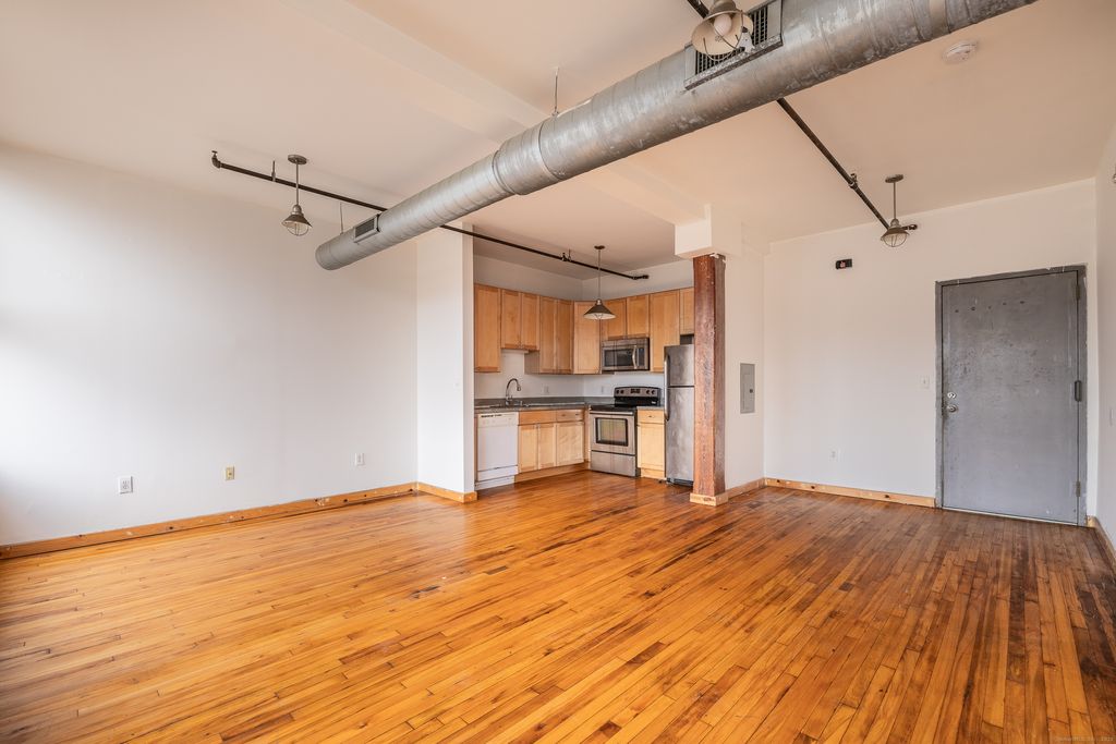 Experience classic loft living in this expansive 1-bedroom, 1-bath condo at The Lofts on Lafayette, offering 832 sq ft of open-concept space. Soaring 10'+ ceilings, original hardwood floors, and exposed ductwork frame a sunlit layout featuring oversized windows and authentic brick walls throughout. The spacious kitchen includes laminate countertops, stainless steel appliances, and natural wood cabinetry, flowing into distinct dining and living zones. The massive bedroom (21'7" x 20'1") provides flexible layout options for a home office, fitness nook, or studio space. A full bath with tub/shower combo and open shelving completes the interior. Central air ensures year-round comfort. Located in Building 8 on the first floor, this unit includes 1 assigned parking space and access to a coin-operated laundry room on the lower level. Pet-friendly community (under 40 lbs; no dangerous breeds - must ask). Just 0.4 mi to Seaside Park, University of Bridgeport, Metro-North station, I-95 access, and coffee shops. Welcome to industrial loft living in the heart of Bridgeport's South End. Industrial loft * Exposed brick + oversized windows * 0.4 mi to Seaside Park + Metro-North