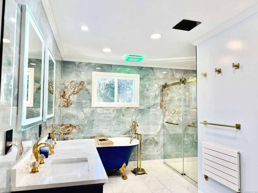 This exceptional property is a rare find, boasting a prime location in highly sought after neighborhood, directly across from the esteemed Country Club of Waterbury. Meticulously remodeled residence offers breathtaking views of the sixth hole of the Donald Ross-designed course. The open floor plan, centered around a stunning three sided fireplace, is sure to impress. Its other unique custom-built features include, cathedral ceilings, wrap around deck, loft area, 2 custom fireplaces, European cabinets, imported Italian marble and refinished hardwood floors throughout. The modern smart home features can be controlled directly from your phone, including appliances, light fixtures, light switches, speakers, heated floors, and fans throughout the residence. The newly designed state of the art kitchen is tailored for culinary excellence. You will appreciate the spacious primary suite, complete with built in electric fireplace, walk-in closet, dressing room, and luxurious spa inspired bathroom boasting heated floors, high end towel and robe warmer and numerous other upgrades (please see attached list). This residence presents limitless opportunities, commencing with the walk-out lower level, formerly an in law suite, now awaiting your personal refinement. With the 2nd kitchen, fireplace and french doors to the backyard possibilities are limitless. Whether entertaining or unwinding, this home is poised to become your dream retreat. This is a must see! Be home for the holidays!