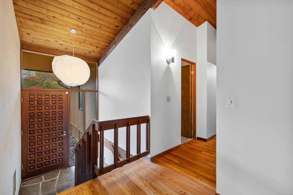 Designed by the renowned Acorn Deck House Company, this striking mid-century contemporary blends timeless craftsmanship with modern warmth. Vaulted cedar ceilings, exposed beams, and walls of glass invite nature inside, filling the home with natural light and serenity. The kitchen opens to a glass-enclosed sunroom and a screened porch-ideal for morning coffee or quiet evenings surrounded by trees. A double-sided brick fireplace anchors the open living area, complemented by hardwood floors and a seamless connection to the outdoors. Set against a backdrop of vibrant woodlands, this home embodies architectural character and peaceful living.