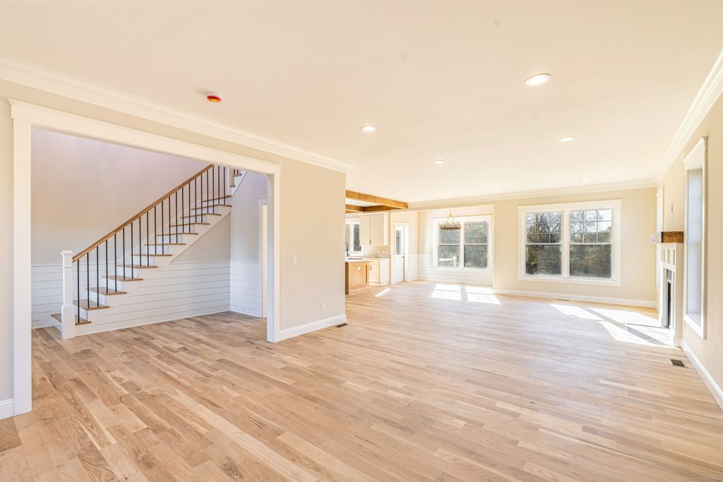 Ready for Immediate occupancy! Nestled in a picturesque East Lyme subdivision, this new construction home showcases exceptional craftsmanship and thoughtful detail in every room. With four bedrooms, two and a half baths, and an additional recreation room, it offers a spacious and inviting layout. The open floor plan is enhanced by white oak hardwood flooring throughout the main living areas, custom tile work in the bathrooms, and quartz countertops in both the kitchen and baths. Natural wood beams in the custom kitchen, complement the shiplap trim details in the breakfast area, wet bar and foyer. The stone fireplace, with reclaimed wood mantel. in the family room creates a cozy focal point. Outside, a private, flat yard provides many possibilities, with the potential to add a pool for even more enjoyment!