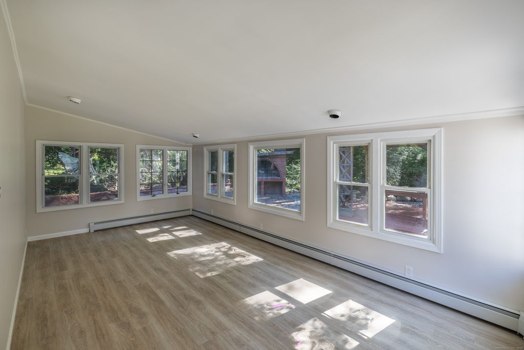 Welcome to 2428 Huntington Turnpike, a beautifully updated oversized ranch in the heart of Trumbull. From the moment you step inside, you will be greeted by timeless charm, including a custom fireplace that creates a warm focal point in the living room and flows seamlessly into the dining area. The updated kitchen is designed for today's lifestyle, featuring granite countertops, modern appliances, and plenty of space to cook and gather. This home offers three spacious bedrooms and two full baths, including a stunning primary suite with a walk in closet, laundry room, and spa like bath with a walk in shower. A heated sunroom off the two car garage provides the perfect spot for relaxing year round, while the partially finished basement adds an additional 540 square feet of versatile living space. Recent improvements include fresh paint, refinished hardwood floors, new vinyl siding, central air conditioning, windows, newer roof and a brand new septic tank, making this home truly move in ready. Outside, the private backyard is a retreat of its own with a custom pizza oven, storage shed, and beautifully landscaped grounds ideal for entertaining or simply enjoying the outdoors. 2428 Huntington Turnpike is more than just a house, it is a place to call home!