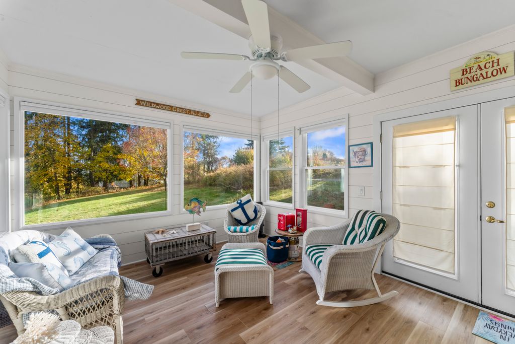 On a quiet cul-du-sac, yet walking distance from the flag pole and shopping, is a vintage cape that has been recently updated and remodeled. This is a 4BR, 3Bath home and is in impeccable condition. The main floor has a gorgeous living room with a fireplace and sliders to a bright 3 season sunroom. There is a 4th bedroom/dining room and a 'sitting room' which can be interchanged as desired. The current 'sitting room' has sliders to a large two-tiered beautiful deck with a matching white picket fence. This arrangement begins to provide the comfort desirable in a home. There is a completely modern kitchen with all new stainless appliances with a double farmers sink and floor to ceiling cabinetry and access to the laundry room. There is a large main level bedroom with an adjacent full bath which can easily be used as a primary bedroom as there is an additional full tiled bath on the main floor. The upper level consists of two very large bedrooms both can be used as a primary. The full bath has a skylight as does one of the bedrooms with a deep walk-in-closet and walk out balcony. The entire home was recently fitted with Pella double paned windows and doors, a new roof and newly painted and matched with the shed. There is an unfinished basement which had been used as a studio and has a full mirrored wall.