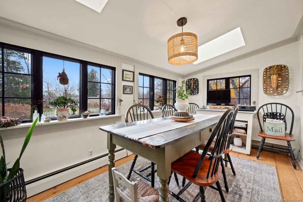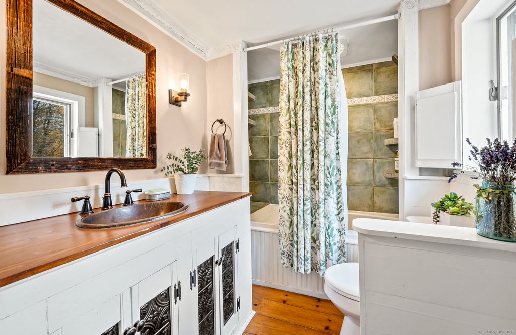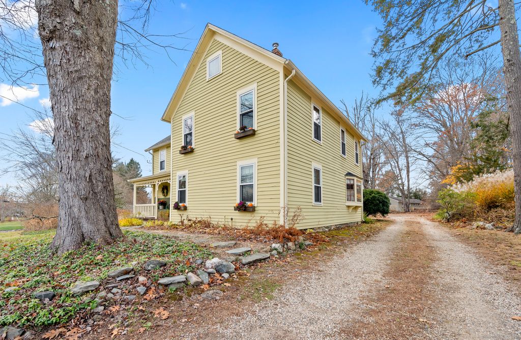 So you love the "Farm House" style? No compromise here! Circa 1840 beauty exudes charm throughout. Artist owned, the home features functional antique pieces combined with all the modern comforts you desire. New kitchen, leathered granite counters, lighting fixtures and appliances; even a walk in pantry! Every room is warm and inviting. Formal and informal dining areas, beehive fire-placed living room utilizes built in wood burning insert. Custom accents include areas of exposed wood, antique Staffordshire wash basin, copper sink & Amish wood shelves. French doors lead to office/den with built-ins and a Rumford fireplace; possible use as 4th bedroom. Two full baths, one on each floor & artistically fashioned, compliment the three main bedrooms. This romantic homestead is set on a level corner lot and bordered by a tapestry of perennial flower beds. Lilacs, lavender, hydrangea, and a gated white picket fence surround the lovely yard; something is always in bloom! Ideal for entertaining, recreation or simple relaxation. Two car barn/garage with loft has its own updated electrical. Enjoy evenings around a fire-pit or in the spacious enclosed screened porch. This unique property is served by public water and sewer. The location is superb... walk to schools, town pool/tennis, walking trails and minutes to Collinsville center, restaurants, and river recreation including kayaking/fishing and more. Two hours to NYC or Boston.