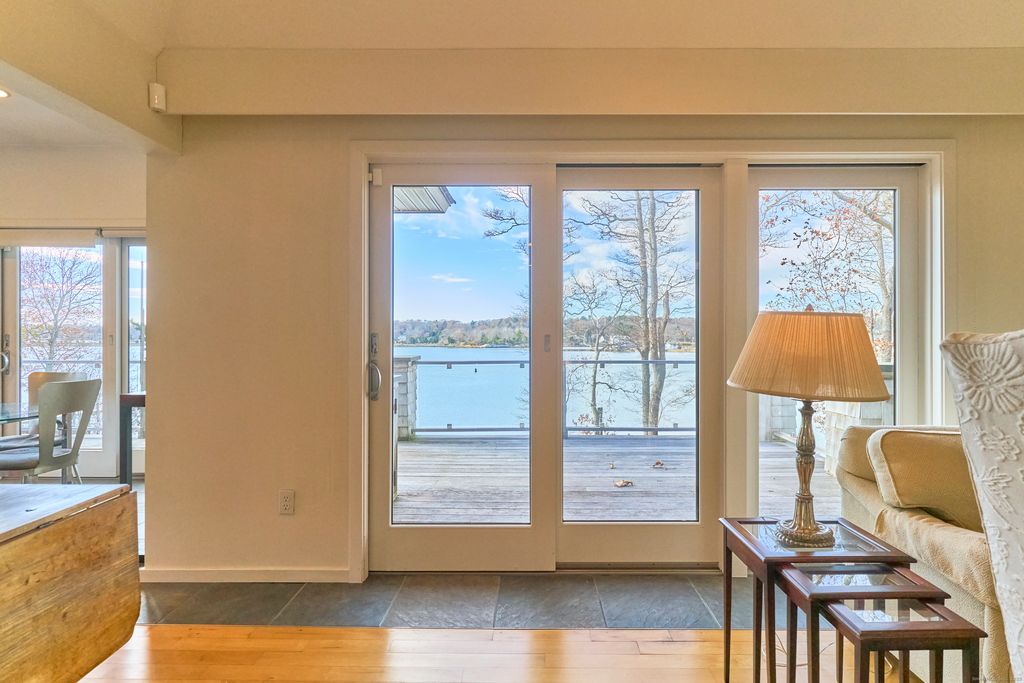 Masons Island - Direct waterfront om The Mystic River with a private dock. Custom designed, stunning contemporary style home beautifully sited on a hilltop overlooking the Mystic River. The living room, dining room and family room wrap around the central fireplace. Wonderfully cheerful kitchen opens to a spacious deck. Main level Primary bedroom includes private bath with a delightful curved walk-in shower. Lower level walkout has a family room, bedroom, bath and wonderfully spacious workshop. 2 car attached garage.