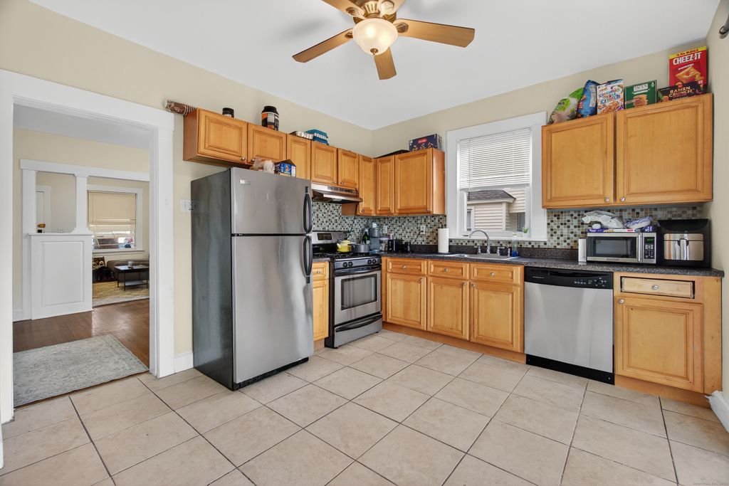 Welcome to this spacious 4-5 bedroom, 2-bath home offering a blend of character and modern comfort. An enclosed sun porch adds extra living space and leads into the main level, where you'll find high ceilings, original hardwood floors, and classic built-ins. The updated, light-filled kitchen features stainless steel appliances and a sliding door to a deck that overlooks a private, fenced backyard. The dining room opens to the living room, creating a warm and functional layout for everyday living or entertaining. Two first-floor bedrooms, including one with a walk-in closet, provide flexibility for guests, work-from-home needs, or single-level living. A full bath completes the main level. Upstairs, a generous landing leads to three additional bedrooms and a second full bath. Additional features include dual-zone high-efficiency gas heat, dual-pane windows, a deck, patio, storage space, and off-street parking for up to four vehicles. The fenced yard offers room to relax and unwind. This property has a strong rental history and offers both comfortable owner-occupied living and appealing investment potential. Conveniently located minutes from shopping, amenities, and major highway access. A versatile home ready for its next chapter.