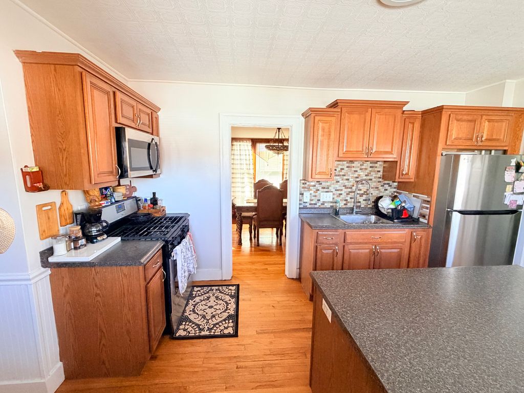 Welcome to this charming and beautifully maintained 2.5-bedroom (yes, you read that right, ".5" additional space, 1.5-bath home, thoughtfully designed for comfort, character, and modern living. From the moment you step inside, you'll feel the warmth and pride of ownership throughout every space. The sun-filled living room features gleaming hardwood floors, large windows, and custom built-ins that add both function and timeless appeal. The inviting layout flows into a spacious formal dining room-perfect for gatherings-highlighted by a stunning stained-glass Tiffany chandelier and rich wood trim. The kitchen offers generous cabinetry, stainless steel appliances, a center island, and ample counter space, making it ideal for cooking, entertaining, and everyday convenience. This home features 2 full-size bedrooms, plus an additional cozy room-perfect for a nursery, office, or personal retreat-offering flexibility to match your lifestyle needs. Outside, enjoy a large backyard with a cement patio, perfect for barbecues, entertaining, or quiet afternoons outdoors. The property also includes a Wood stove-heated 2-car garage with full electric, providing the ultimate convenience for hobbies, storage, and year-round vehicle protection. MAJOR VALUE ADD!! Sellers are considering paying off the solar panels and remaining roof balance for the new owner's peace of mind, offering the incredible benefit of essentially NO electric bill!!!!