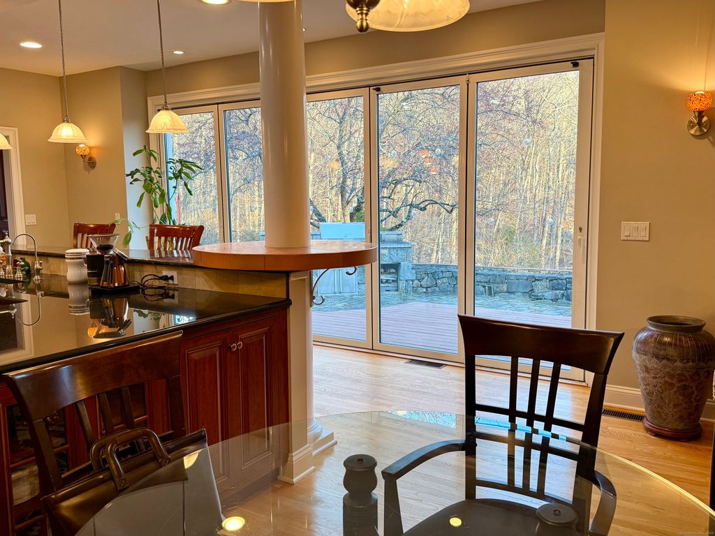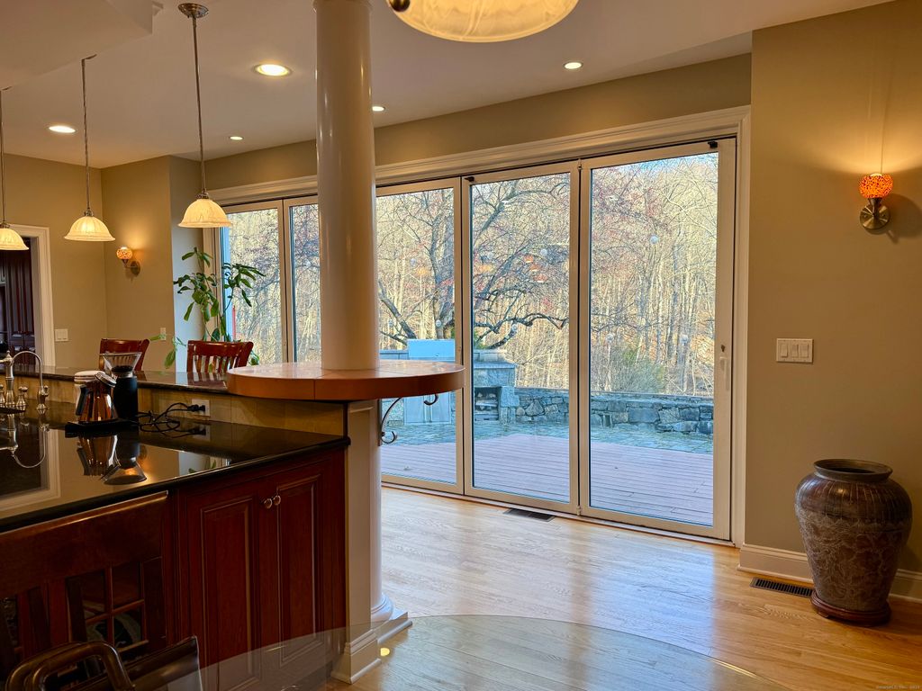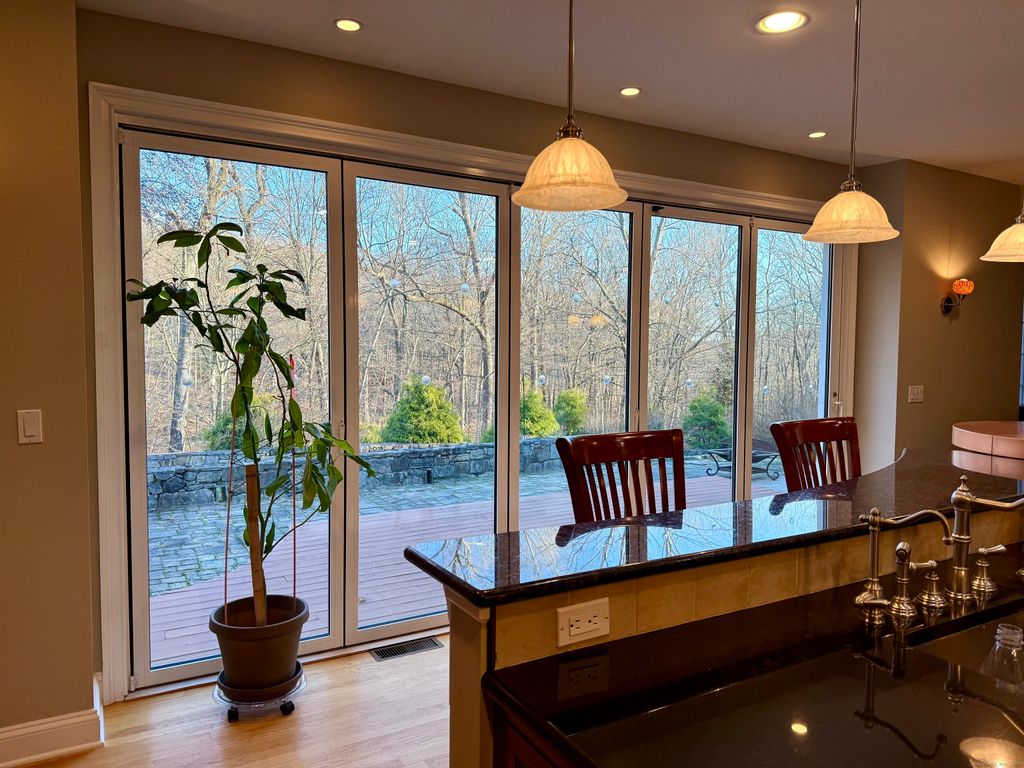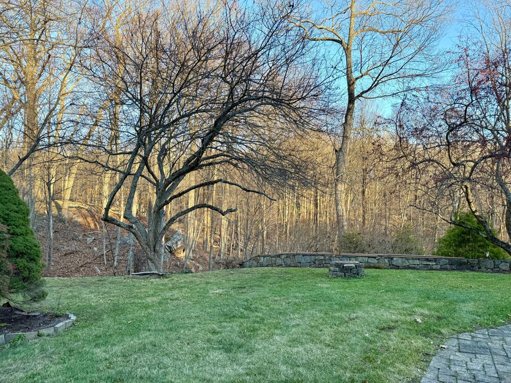 Welcome to this expansive and beautifully updated 4-bedroom, 3 full/3 half-bath center-hall colonial, perfectly situated on a hill in a private cul-de-sac with1.13 acres bordering open space. Enter the entry foyer with marble flooring, to the soaring 2-story high great room with a fireplace, this open-concept floor plan blends timeless elegance with thoughtful design. Step into the heart of the home - a fully open-concept kitchen -living space featuring a chef's kitchen with granite countertops, a stainless-steel farmer's sink plus a 2nd copper sink, custom cabinetry with pullouts and drawers, new appliances including a full-sized separate Viking refrigerator and Viking freezer with a built-in microwave and entertainment center in the middle. The Wolf gas stove and 2 ovens have 6 burners and a griddle and a beautiful custom hood of copper and stainless steel. The length of the kitchen features a 15-foot "Nanawall" which is a floor-to-ceiling retractable set of 5 panels of windows/doors which open completely up to the beautiful outdoor space, featuring a custom deck and stonework with a built-in Viking Grill and Barbeque station and a full-house generator (Generac). A Sunsetter awning, LeafGuard gutters and a rebuilt chimney, new AC units and a 500-gallon propane tank (installed underground) for year-round comfort and security.