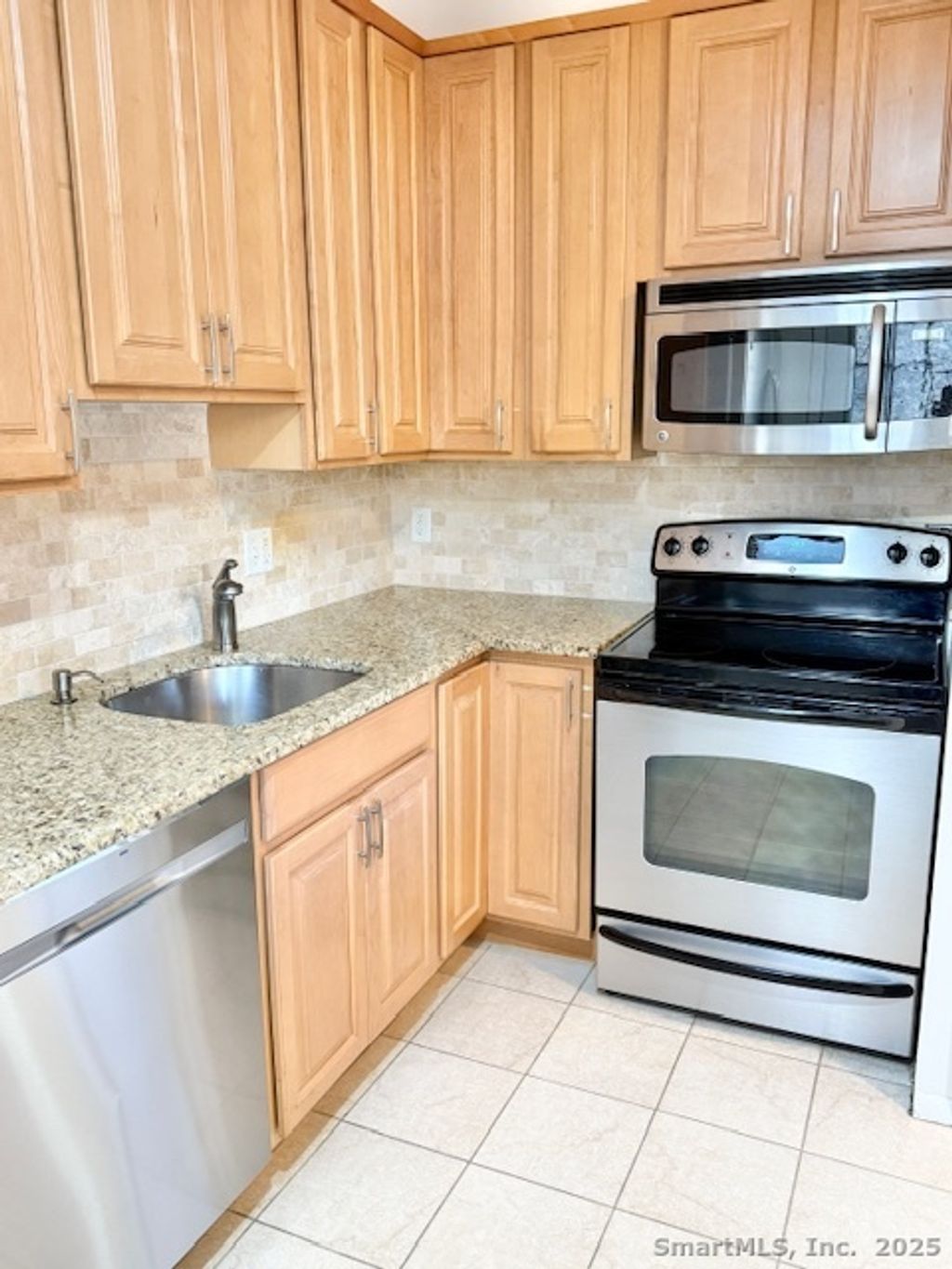 Welcome Home! Discover this exceptional Condo Rental tucked away in The Chesterfield-one of Stamford's most sought-after gated communities. Enjoy resort-style living with two in-ground pools, a clubhouse, 24-hour security, and beautifully landscaped grounds. Located in a prime location directly across from Ridgeway Shopping Center. Walk to shops, gym, two grocery stores (Whole Foods is just up the street), plus easy access to I-95, the Merritt Parkway, and Metro-North. Step inside this spacious unit which has been beautifully updated throughout. The Living Room features gleaming hardwood floors, a fireplace, soaring ceilings with skylights, open to the dining area and kitchen boasting stainless steel appliances, granite counters, stone tile backsplash and washer/dryer. Step out the sliders to your private deck to relax and dine alfresco. There are two generously sized bedrooms and two renovated baths, including a primary suite with double closets and en-suite bath. In summer, enjoy lounging by the pool or take a short walk downtown to experience all Stamford has to offer, shops, dining, and entertainment. Included are two unassigned parking spaces and abundant guest parking. Tenant pays electricity, which includes heat which runs $242/mo average for the year. Tenants must have Excellent Credit and References. Sorry, no pets.