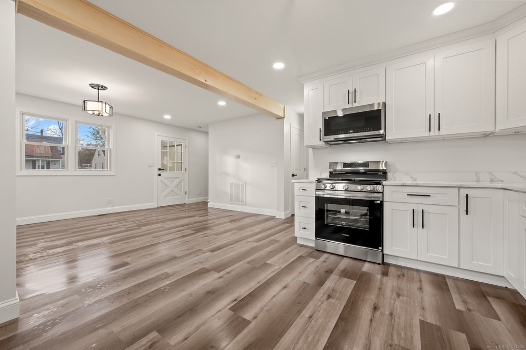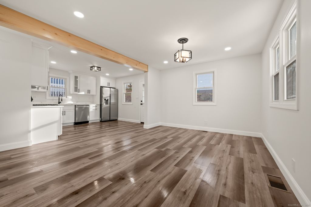 Welcome to 106 Barnes St in New Britain. This recently updated home will capture your interest the moment you pull into the driveway. A larger than imagined home has been renovated from top to bottom. A first floor primary bedroom sits across the hall from the brand new full bathroom which includes new tile, vanity, lighting, and shower. The redone kitchen includes brand new quartz countertops, stainless steel appliance with a gas range, cabinets, luxury vinyl flooring and lighting. The kitchen opens up into the dining room with more than enough space to host every day meals and larger gatherings for holidays and special occasions. The main level living room with a slider out to the rear of the house is perfect for enjoying your favorite tv shows all while enjoying the ambiance of the newly added electric fireplace. A room just off the living room is the perfect space to add a desk or comfy chair to do work or some reading all while enjoying the comforts of the newly added fireplace. Two nice sized bedrooms on the second level with plenty of storage space. Laundry room with hookups are available on the main level. This home also includes a brand new heating system and hot water heater and a new roof. Brand new central air system was added to the home as well. A private driveway with a spacious deck with a fenced in the back yard. Quiet neighborhood on a cul de sac and very close to Westfarms Mall and shopping in Plainville. Don't miss out on this amazing home!