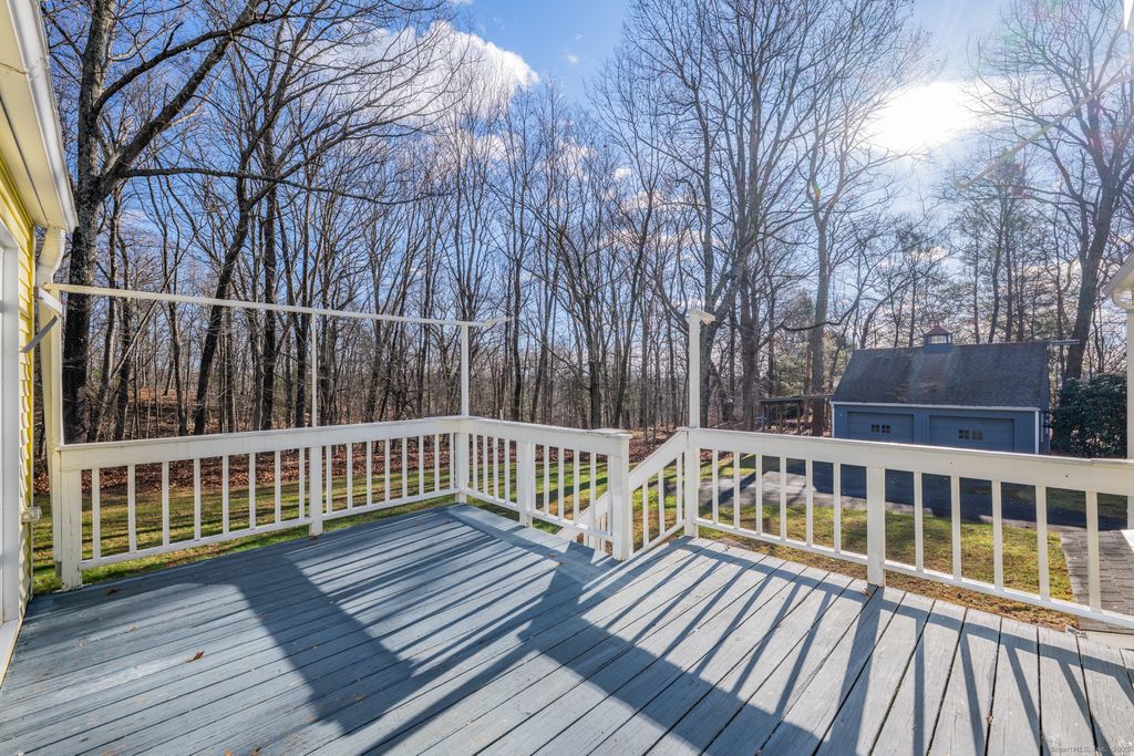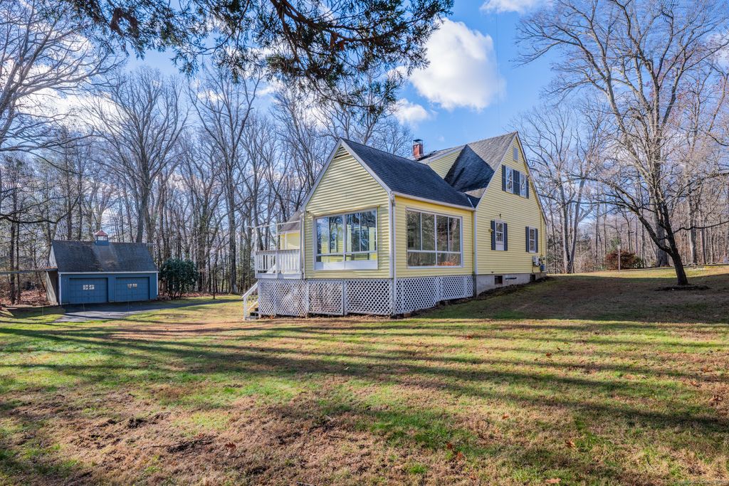 Discover this meticulously maintained Cape-style home set on 3.4 private acres in Woodbury. The property offers exceptional curb appeal, featuring a paved circular driveway and a classic stone wall that sets a welcoming tone. Inside, a beautiful slate tile foyer opens to hardwood floors and a comfortable, well-designed layout that creates an inviting atmosphere. The main level includes a generously sized living room, a dining room with a pellet stove and an elegant bow window, and an eat-in kitchen. This level also offers two bedrooms with ample closet space and a full bathroom. Adjacent to the kitchen and dining area is a spacious, heated sunroom filled with natural light-an ideal spot for relaxation.The upper level features two additional bedrooms with hardwood floors, another full bathroom, and a versatile mixed-use room which works nicely for crafts, storage, or additional closet space. Outdoors, a nicely appointed deck offers the perfect place to unwind and enjoy the serene surroundings. The property also includes a detached two-car garage with overhead storage, ideal for tools, hobbies, or additional equipment. If you're seeking a comfortable home that offers space, privacy, and a peaceful setting, this property is certainly worth your consideration.