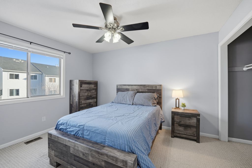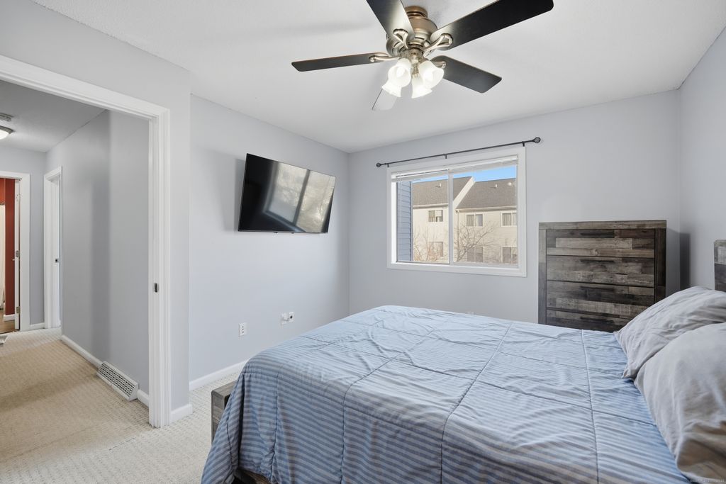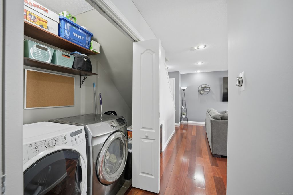 Step into this beautifully updated townhouse in the sought after Staffordshire Commons community. The main level welcomes you with modern finishes and gleaming wood flooring throughout. The kitchen features stainless steel appliances and space for a breakfast bar, while the spacious living room offers plenty of room for a dining area, a built-in beverage fridge, and sliders that open to a private deck perfect for morning coffee or relaxing outdoors. A convenient half bath and in unit laundry complete the first floor. Upstairs, you will find a generous primary bedroom with a walk in closet, a second comfortable bedroom, and a full bathroom. This home also includes a two-car garage, an outdoor storage closet, central air, and a shared carport for added convenience. Located close to local shops, dining, and major highways, this townhouse offers both comfort and ease of living. Schedule your showing today!