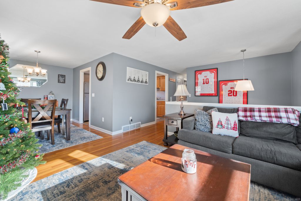 Welcome home to comfort, convenience, and value in quaint South Meriden! Tucked away at the end of a quiet cul-de-sac, this inviting home offers the privacy you want with the location you need. Step inside to find a bright and functional layout featuring hardwood floors throughout most of the main level and a well-appointed kitchen with warm cabinetry and stainless steel appliances. The living and dining areas flow seamlessly, making it easy to entertain or relax at home. Downstairs, you'll love the brand new, cozy carpeting in the lower level - perfect for a family room, home office, gym, or additional living space. Natural light fills the main living areas, creating a warm and welcoming atmosphere throughout. Out back, enjoy a fully fenced-in yard ideal for pets, play, gardening, outdoor gatherings and don't forget, enjoy the Hubbard Park fireworks from your deck! This quiet cul-de-sac, side-walk lined development adds an extra level of peace and limited traffic while still being close to shopping, dining, and highways. This home is an excellent opportunity for buyers looking for space, location, and value - all in one package. Don't miss your chance to make this South Meriden gem yours!
