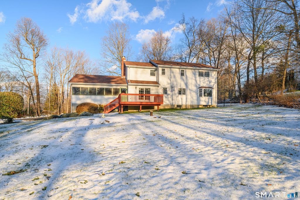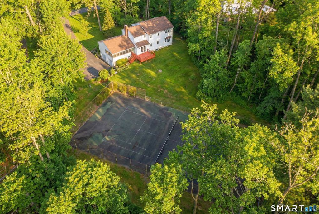 This stunning Colonial sits proudly in a highly desirable New Fairfield neighborhood and has been lovingly maintained throughout by the original owner. A charming front porch warmly welcomes you into the home. Inside, the foyer opens to a spacious living room, perfect for gathering with guests, flowing seamlessly into the formal dining room and kitchen, complete with a built-in breakfast table for everyday meals. To the right of the foyer, the expansive family room stretches from front to back of the home and features a brick fireplace and sliders to the rear deck, making it the true heart of the home. The main level also includes a bright sunroom, convenient half bath, and a large home office with a separate entrance-ideal for remote work or a private workspace. Upstairs, you'll find a generous primary bedroom with an updated ensuite bathroom, along with three additional well-sized bedrooms, all featuring hardwood floors, and a full bathroom with tub/shower. Hardwood floors run throughout most of the home, with tile in the kitchen and bathrooms. The lower level offers a 2 car garage, and large, open basement with laundry area, abundant storage, and endless potential for future finished space. Outside, enjoy mature plantings that provide beauty and privacy, along with the rare luxury of your own private tennis court right in your backyard-an exceptional feature that truly sets this home apart.