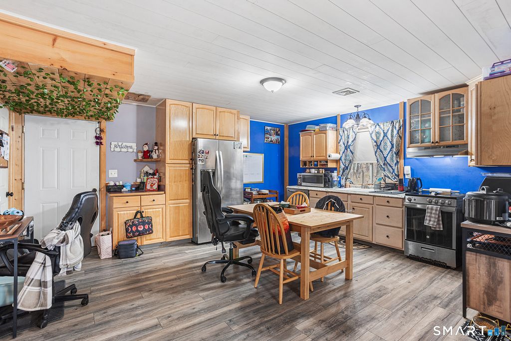 Welcome to 600 Woodtick Rd in Wolcott. This inviting home features a bright, open main level with cathedral ceilings, exposed wood beams, and recessed lighting that create a warm and airy atmosphere. The spacious layout blends the living room, dining area, and kitchen into one cohesive space-perfect for entertaining. The kitchen stands out with a large center island, granite countertops, and stainless steel appliances, offering both style and functionality. The main level includes a primary bedroom with its own ensuite bath, a second well-sized bedroom, and an additional full bath. The finished lower level provides exceptional flexibility, featuring a studio-style in-law or guest suite complete with its own kitchen, full bath, and private entrance. Ideal for extended family, visitors, or potential supplemental living space. Move-in ready and thoughtfully designed, this home delivers comfortable modern living with room for everyone.