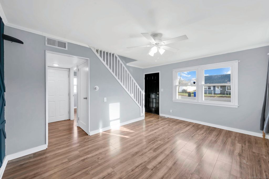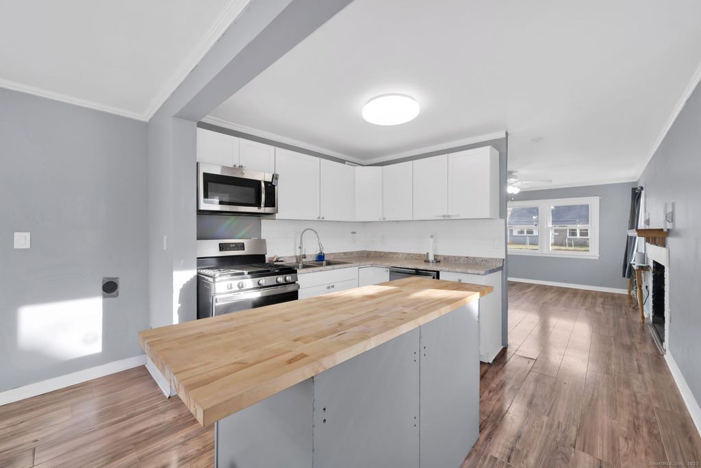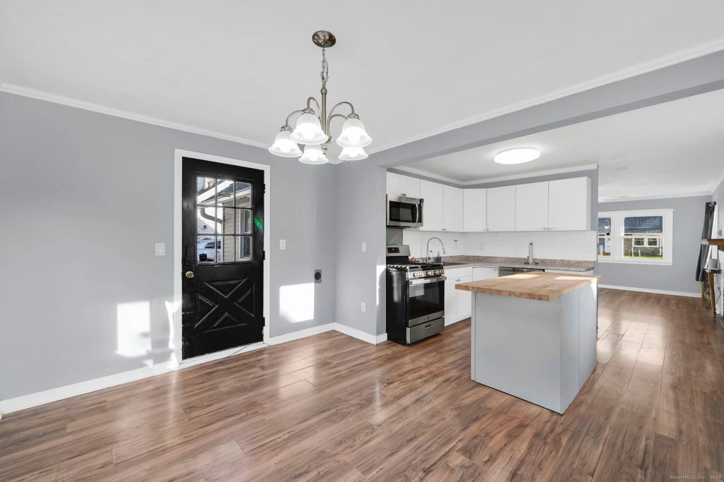 Welcome to this beautifully updated Cape set on a generous 1/2-acre lot in the Glen Hills section of South Meriden. The home opens to a bright, open-concept kitchen and dining area featuring an island ideal for everyday meals while still offering room to host family gatherings. A gas stove adds convenience and efficiency. The kitchen flows into a warm and inviting living room complete with a centerpiece accent wall and fireplace. The main level includes two comfortable bedrooms and a full bath, an excellent layout for those seeking main-floor living options. Upstairs, you'll find two additional bedrooms that offer flexibility for guests, home office needs, or growing households. Outside, the expansive yard provides space for play, gardening, or outdoor entertaining, and the detached two-car garage offers storage, workshop potential, and convenience. The home includes a newer roof, natural gas heat, and public utilities. Located minutes from Hubbard Park, Giuffrida Park, South Meriden shops, and neighborhood schools, this home provides easy access to outdoor trails, everyday errands, and local amenities. Commuters will appreciate quick connections to I-691, I-91, and the Meriden Train Station, offering direct links to New Haven, Hartford, and beyond.