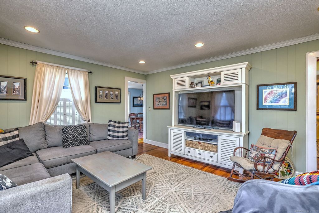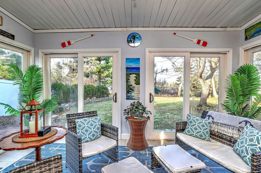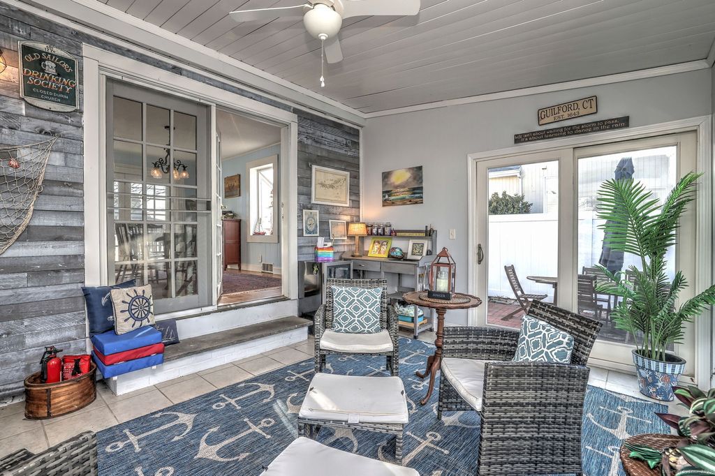 OPEN HOUSE 12/14/2025 CANCELLED DUE TO WEATHER. Whether you are looking for a second home or year round living by the water, this is the home for you. Walkable to the town boat dock and 2 restaurants, town beach, train station and vibrant downtown area with shops, restaurants and the prettiest New England green on the shoreline. Perfect for one floor living with two bedrooms and a full bath downstairs and two bedrooms and a full bath upstairs with bonus loft space. First floor has a spacious living room leading to a generous size dining room. There is an ipe deck out the front of the dining room with marsh views. Updated kitchen with Viking gas stove, Nantucket pebble backsplash and black granite. Off the dining room we find a lovely 3 season porch which adds an additional 165 of square footage with walls of sliders and a gas fireplace. Perfect place to enjoy nature, read a book or have a glass of wine. Two bedrooms and an updated full bath complete the first floor. Hardwood throughout first floor. Upstairs, there are two bedrooms and an updated full bath and an upper open loft space perfect for TV watching, office or working out. Finished room in lower level also great for even more space. Level lot with oversized shed and privacy. Brick patio outside next to sunroom for al fresco dining. Live by the water without the extra cost of flood insurance. Guilford is one of CT's jewels. Waterfront community with easy access to 91 & 95, local train station to New Haven.