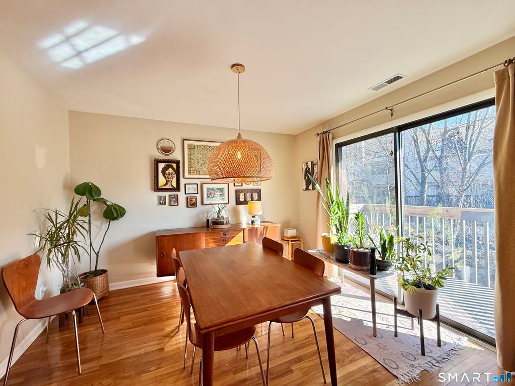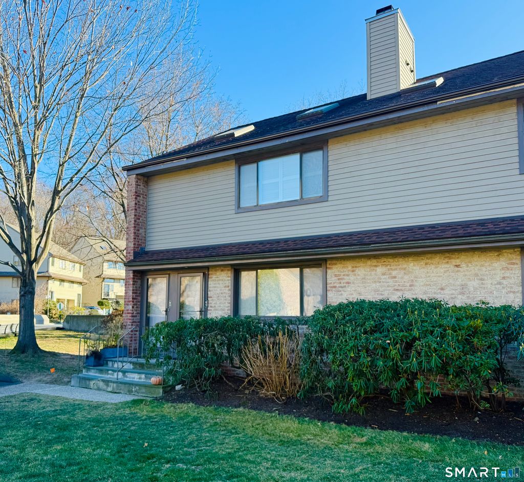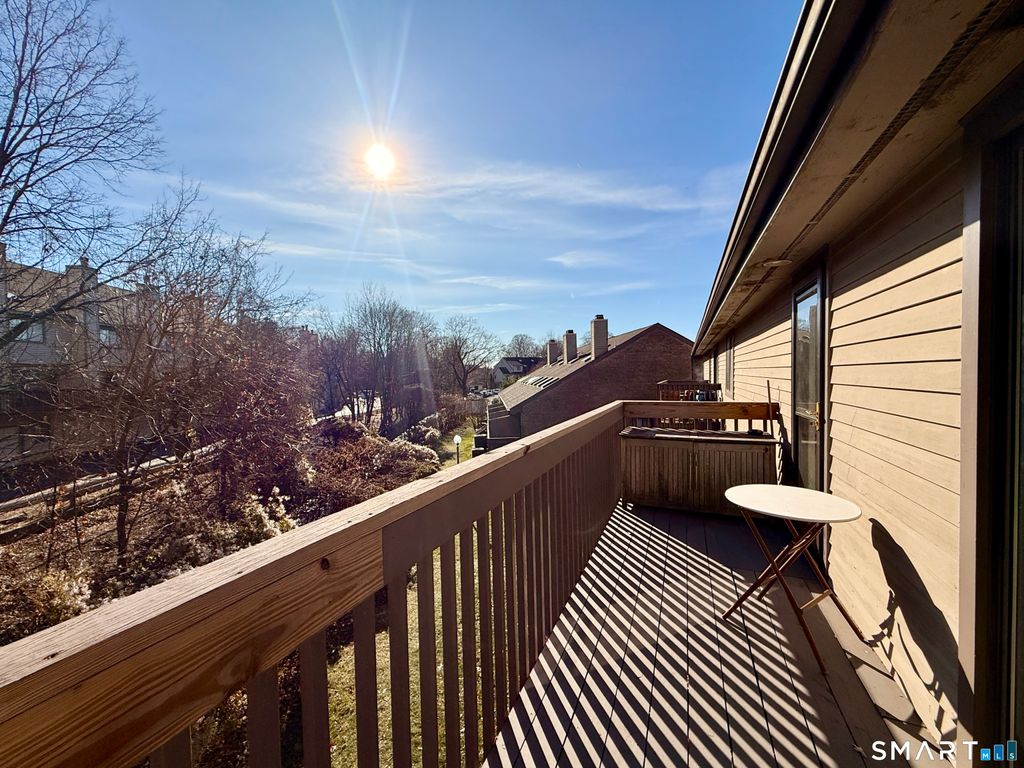 Bright and spacious 2-bedroom, 2-full-bath second-floor end-unit in Stamford's sought-after Chesterfield gated community. Tucked at the end of the building for added privacy and flooded with natural light from oversized windows and skylights, this home feels open and airy the moment you step inside. The inviting living room features dramatic vaulted ceilings, a cozy wood-burning fireplace, and direct access to your private deck - ideal for morning coffee or unwinding after a long day. A separate dining room flows seamlessly from the efficiently laid-out kitchen, creating the perfect setup for both daily living and entertaining.Both bedrooms are generously sized with excellent closet space, and the primary includes its own full bath. A rare pull-down attic offers exceptional storage you won't find in most condos.