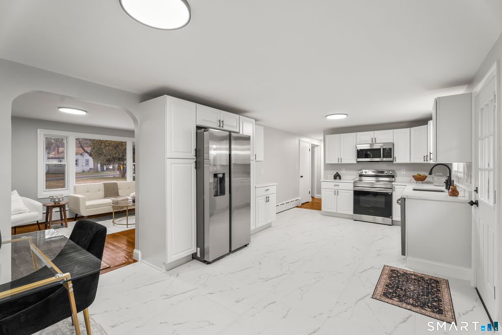 New Year, New Home! You haven't seen one like this in a while!! This home features a must see oversized primary bedroom with en suite, an oversized living room, a large kitchen, and a sunroom overlooking an expansive, private, 1.74 acre yard. Welcome to this fully renovated, sprawling one level living L-Shaped Ranch style home!! This move in ready property offers 3 bedrooms, 1.5 baths, and 1344 square feet of one story living, filled with natural light throughout and highlighted by beautiful hardwood flooring. Inside, you'll find a thoughtfully updated interior featuring an updated kitchen, remodeled bathrooms, and many updates. The layout offers an easy flow between rooms, including a living room with a cozy fireplace. This home also provides excellent closet space throughout, adding to its practicality and livability. Did we mention the primary bedroom has TWO large closets? A bright three season sunroom provides additional space with views of the expansive yard. The full unfinished basement offers excellent storage capacity, and the attached garage provides convenience. The back yard is a standout feature, offering a large, usable lot area suitable for recreation, gardening, outdoor entertaining, and future enhancement. Less than 5 minutes to I-91! Talk about location!!!