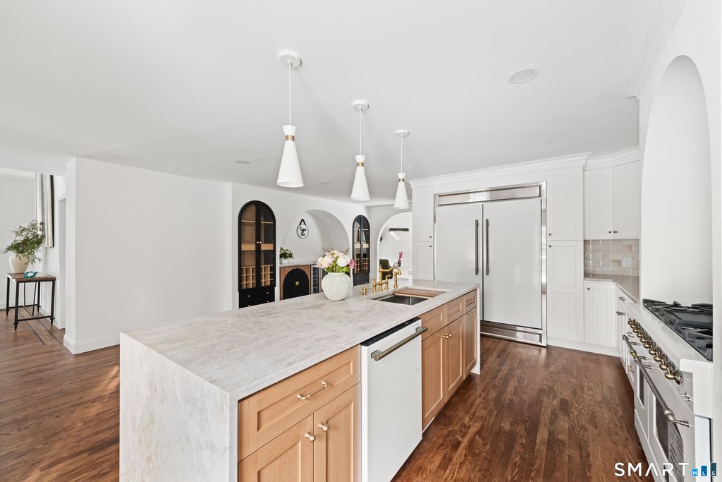 Experience the essence of harmony in this charming Colonial home, where timeless elegance meets the comfort, and sophistication This beautifully crafted residence featuring 4+ bedrooms and 2.2 bathrooms, located in the desirable neighborhood in Wilton. The main level open plan offers a bright and welcoming living room with a fireplace, overlooking an over sized deck. The elegant dining room features a built-in arch. Enjoy The magnificent chef's kitchen is outfitted with top of the line taj mahal countertop, New appliances, 48" gas stove, 60" Sub-Zero refrigerator, and a pantry along with a Custom coffee bar. Luxury woodwork in the family room completed with an attractive arch and a fabulous fireplace. The main floor bedroom used as an office with spectacular views, perfect for remote work or study. The second floor offers a primary bedroom suite which includes a walk-in closet, a remodeled modern primary bathroom with walk-in shower, floating tub, and a double sinks vanity. A full bath, 3 additional bedrooms with access to the unfinished above the garage bonus room. and laundry set-up.515 sq. ft. finished basement with a fireplace provides endless possibilities with a walk-out door and half bathroom. New construction: two car garage and mudroom, above the garage another 650sf unfinished bonus room ready to be finished. New driveway, walkway, Freshly painted inside and outside, new hardwood floors, New light fixture, Custom kitchen detailed and primary bedroom, Fully reno