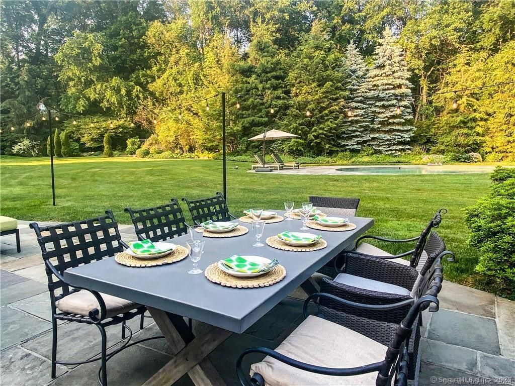 Summer House with pool: Just one hour from NYC and two miles from the charming small town of New Canaan, buzzing with boutique shops and outdoor restaurants, this elegant, private family retreat sits on two quiet manicured acres. Perfect for relaxing poolside, swinging in a hammock, gathering by the firepit in Adirondack chairs or dining on a string-lit stone patio. The neighborhood is ideal for biking and walking, with plenty of young families. This spacious, fully-equipped home features 5 bedrooms and 4.5 baths, comfortably sleeping 8. Gourmet eat-in kitchen with pool view, living room, family room, large office area with views of the backyard and pool. Main floor bedroom has a king bed (or two twins) and ensuite bathroom. This room can convert to a second office with the twin beds moved down to the finished basement for extra guests. The second floor offers a primary suite with king bed, ensuite bathroom with shower and soaking tub. Three more bedrooms (one queen, two full) share two generous hall bathrooms. Other amenities include: Game room with pool table, large laundry room, wi-fi extending out to the pool, grill and Traeger wood-pellet smoker. Available from July 26th through Labor Day.