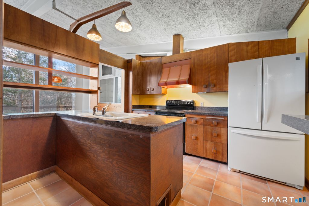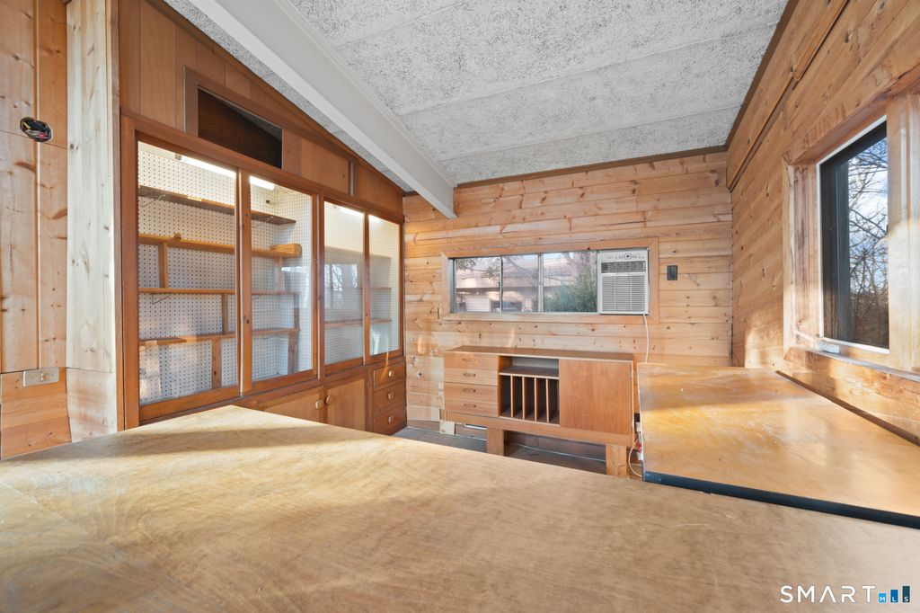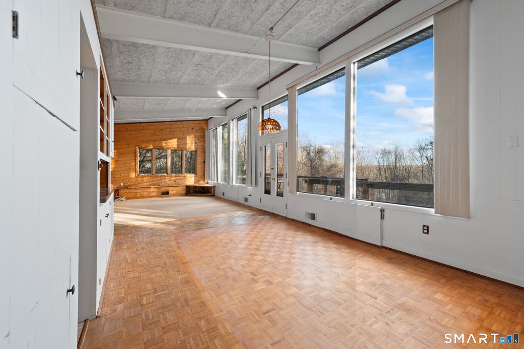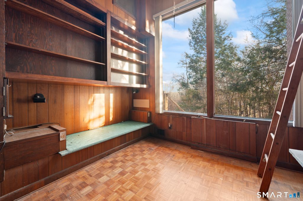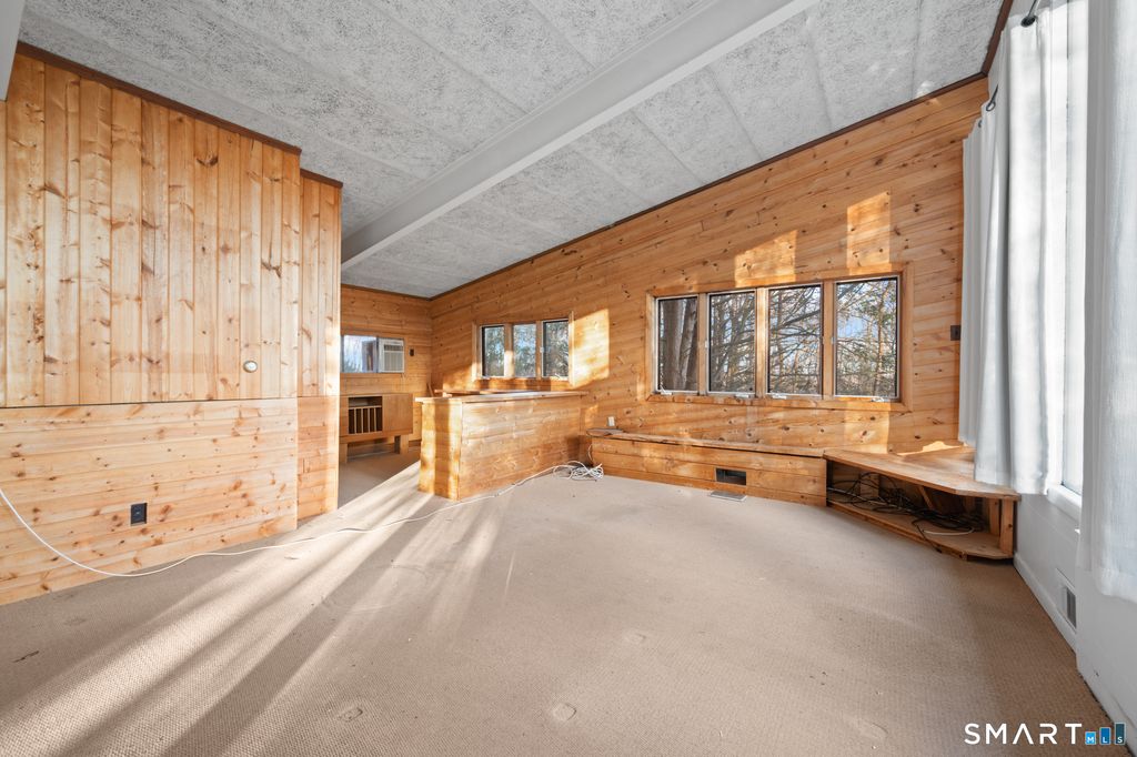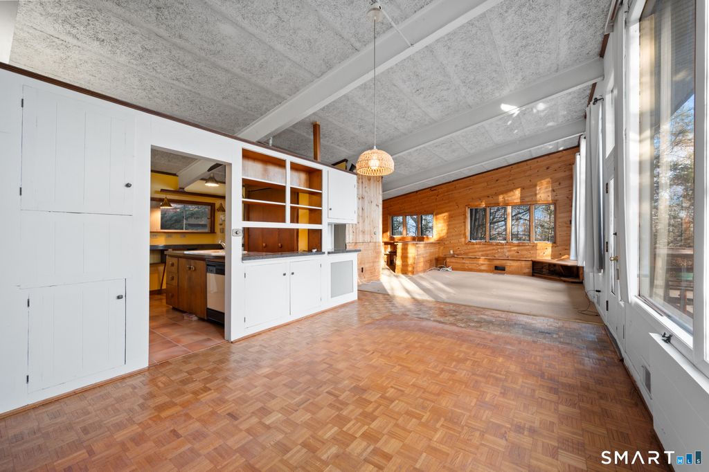 Authentic Mid-Century Modern retreat set on over 3 private acres, this truly one-of-a-kind home celebrates timeless design and architectural integrity. Original finishes remain beautifully intact, highlighted by soaring vaulted ceilings and dramatic two-story windows that flood the home with natural light and offer seasonal views of Andover Lake. True to its mid-century roots, the home features fascinating yet highly functional details, including hidden compartments, custom built-in storage, and thoughtfully designed display casings throughout. A stunning library with a classic step ladder and cozy reading nook is bathed in sunlight from the expansive two-story windows, creating an inspiring space for relaxation or study. The open-concept living and dining areas are framed by walls of glass and vaulted ceilings, delivering a seamless flow and an airy, light-filled atmosphere. Solid steel beam construction adds both architectural distinction and enduring strength, blending form and function in iconic mid-century style. Additional highlights include a deck with seasonal lake views, green house, sauna, a detached two-car garage, and a circular driveway that enhances curb appeal and convenience. This remarkable property is a rare opportunity for mid-century modern enthusiasts and must be seen to be fully appreciated. Home sold AS-IS.