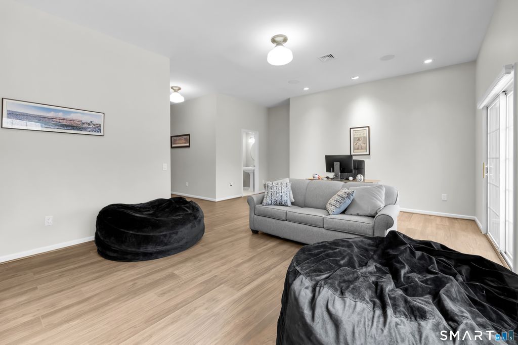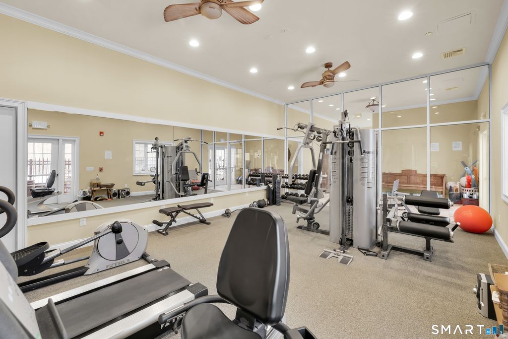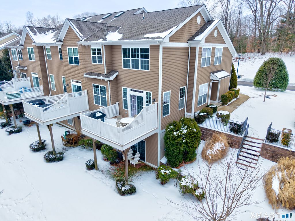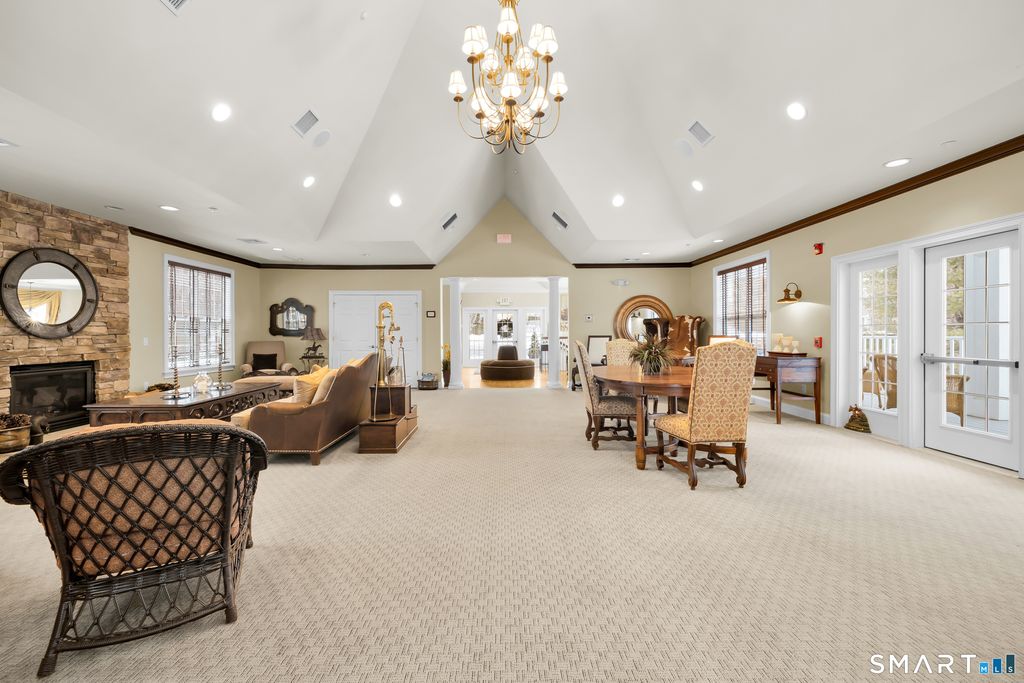 Set within a peaceful, wooded community in the Town of Litchfield, this beautifully maintained end unit offers impressive living space, lofty 10ft ceilings on the lower level, elegant finishes, and a highly versatile layout. The main level showcases hardwood flooring, crown molding, recessed lighting, and oversized windows, creating a bright, airy atmosphere throughout. The open living and dining areas flow effortlessly, making the space ideal for both everyday living and entertaining. The kitchen features warm wood cabinetry, dark countertops, stainless steel appliances, and a dedicated dining nook, blending functionality with timeless style. The primary suite serves as a comfortable retreat with a walk-in closet and private en-suite bath. The interior has been freshly painted throughout in 2025, giving the home a crisp, move-in-ready feel. The finished lower level truly elevates the home, offering a spacious family room with a fireplace, a stylish entertaining area with a built-in bar, a dedicated gym space, and a walk-out to the backyard beneath the deck, seamlessly connecting indoor and outdoor living. Recent upgrades include a new roof (Nov 2025), new heating system (2025), water heater (2024), and Trex deck (2019). Residents enjoy access to exclusive community amenities including a heated pool, clubhouse for entertaining, and fitness area, multi-sport court, all set against a serene, nature-filled backdrop with a nearby creek.