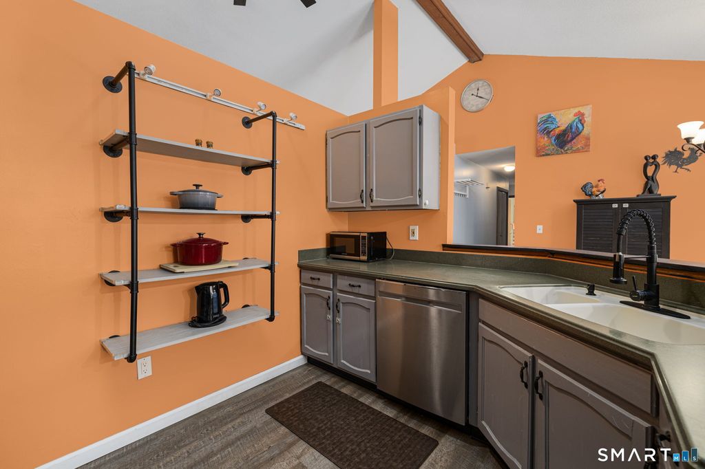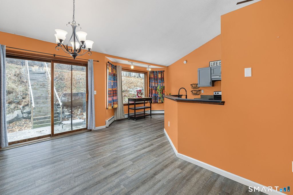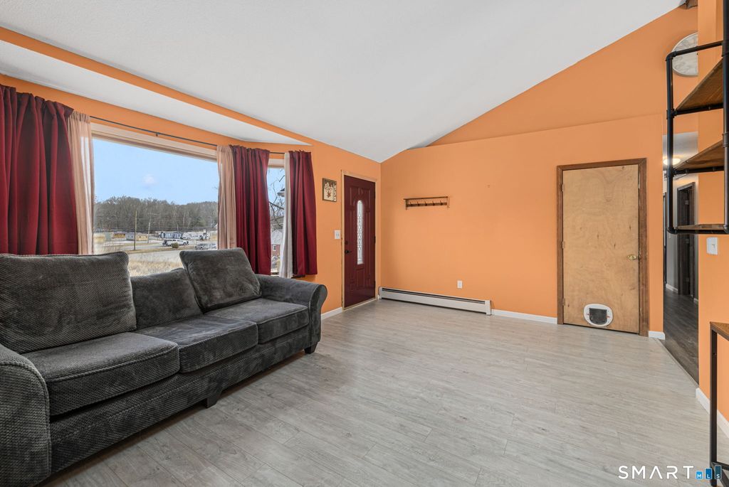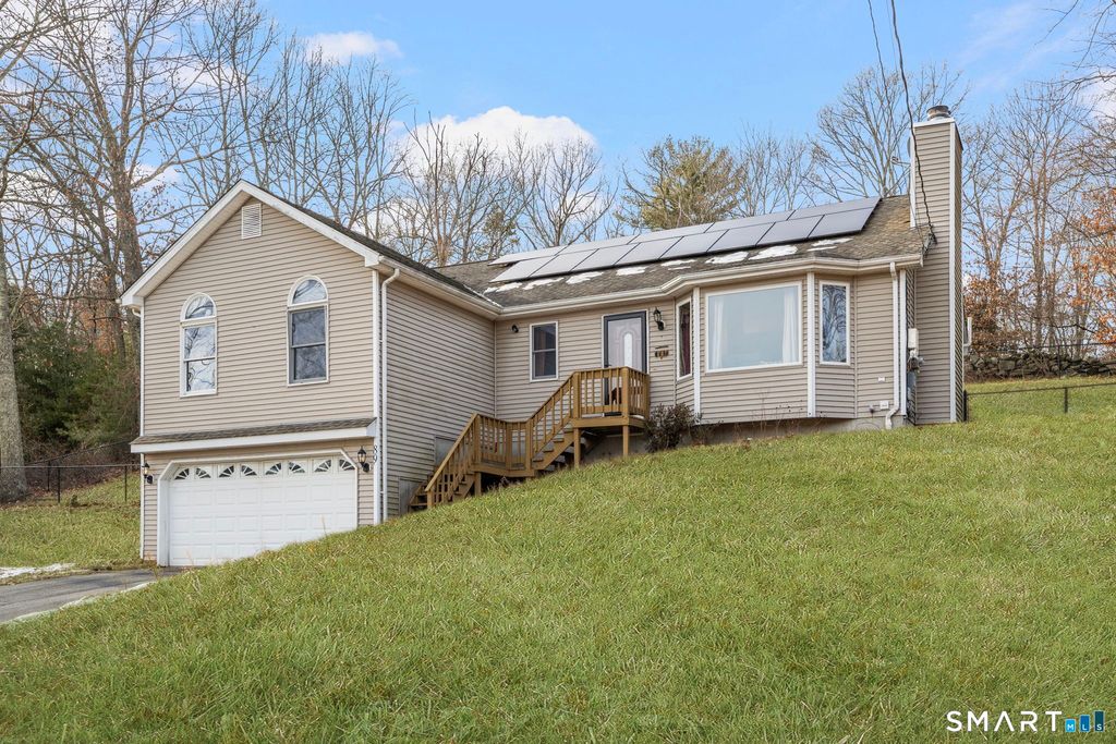 Spacious contemporary ranch offering 3 bedrooms, 2 full baths, and a 2-car garage. The open-concept living room, kitchen, and dining area features cathedral ceilings with vinyl flooring flowing throughout the main living space. The living room offers abundant natural light, a fireplace, and views of the Moosup River. The kitchen and dining area include stainless steel appliances, ample countertop and cabinet space, and custom open shelving for additional storage. A slider off the dining area leads to a stamped concrete patio and a partially fenced backyard. The patio is tucked into a hillside for added privacy, with stairs leading to a large cleared rear yard. The oversized primary bedroom features a walk-in closet and an ensuite bath with a jetted tub and stand-up shower. Two additional bedrooms and a full bath with a tub and shower complete the main level. The unfinished basement offers excellent storage and potential for future finishing. Laundry hookups are available on both the main level and in the basement. In 2024, the sellers improved the home with a new chimney chase cover, caps, collar, and seal, a new oil tank, and a new well pump. Additional features include solar panels for low electric costs, city sewer, and well water. Conveniently located with easy access to Route 12, Route 1, and I-395, close to the Rhode Island border, as well as nearby shops and dining.