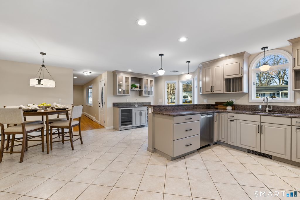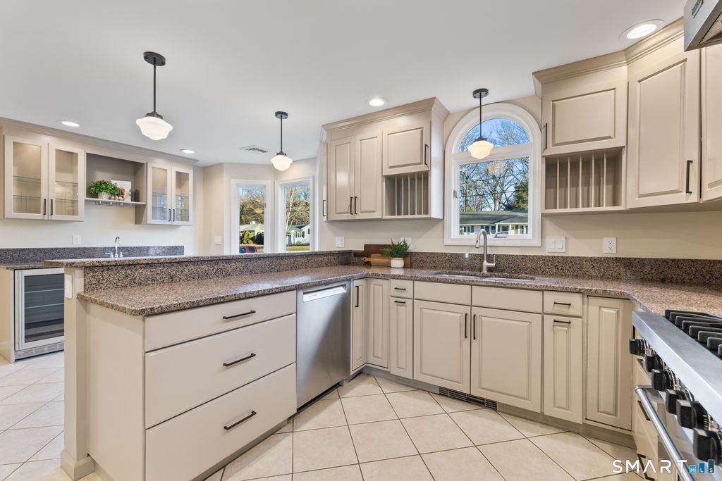 This fabulous remodeled ranch seamlessly blends modern upgrades with exceptional living spaces, perfect for both relaxation and entertaining. The updated eat-in kitchen features a 6-burner Viking gas range, granite counters, tiled floors, and a breakfast bar adjacent to a charming nook with a wet bar, wine cooler, and extra cabinetry. Living room hardwood floors, a bay window, and a cozy wood-burning fireplace, while the dining room slider opens to a Trex deck overlooking the beautifully landscaped yard. The primary bedroom offers direct access to back yard, and the main bathroom has been updated with a new vanity, fresh paint, and stylish lighting. The fully finished lower level includes a 12x13 family room with gas fireplace, office area, recessed lighting, and a half bath. Outdoors, enjoy a stunning patio, an inground salt water pool, newer pool filter, with a pergola living area featuring electricity, a ceiling fan, and a wet bar, as well as a gazebo with cable TV hookup. With $64,000 being spent in the last 6 months on major improvements, this home is truly move in ready, to include central air, new boiler and water heater 2025, brand new roof 2026.