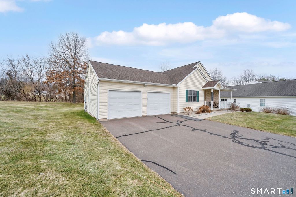 Beautifully maintained 1,454 sq. ft. Ranch in 55+ Quail Hollow complex. This home is move in ready and includes a 2-car garage. This south facing property is drenched in natural light and includes an inviting front porch, and a bright Foyer and Living room. The foyer opens majestically to a cathedral ceiling Living room with immaculate hardwood floors. An open design floor plan includes the adjacent hardwood floor equipped Dining room, abundant recessed lighting and slider access to private rear deck. The eat-in Kitchen is both beautiful and functional. It includes distinctive cabinetry, tiled backsplash, new stainless appliances and granite countertops. The Primary bedroom includes an oversized walk-in closet, new ceiling fan and a nicely appointed private full bath. A second Bedroom, common full bath and an off-kitchen laundry room complete the living space. The lower level is unfinished with walkout and provides plenty of storage and the potential for a large recreational space. Updates include a new porch railing, fresh neutral color interior paint, newer bedroom carpets and ceiling fans. Updated accent lighting throughout. Natural gas and public utilities.