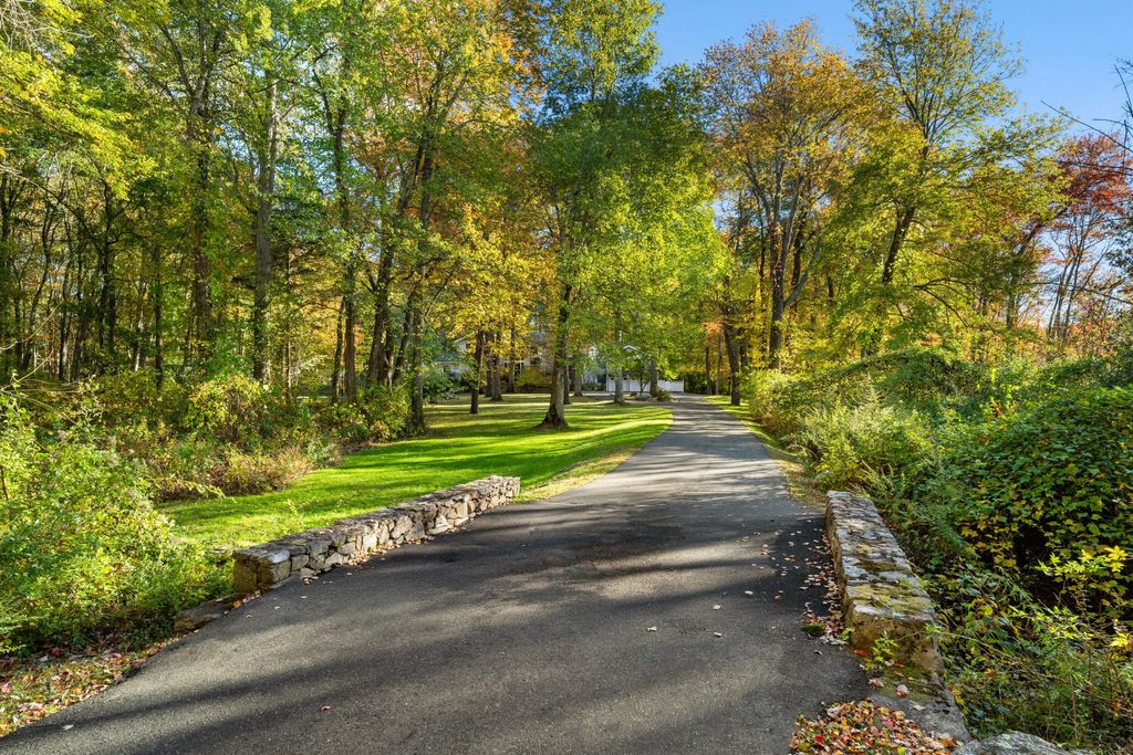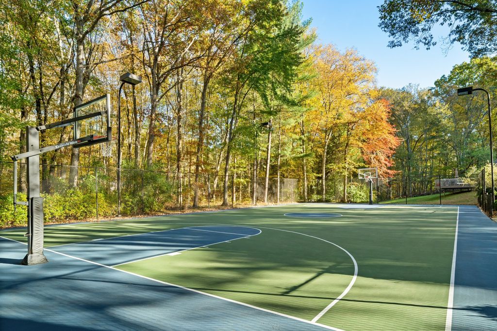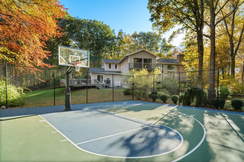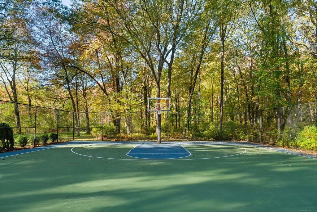 Discover the serenity of 335 Georgetown Road, where a grand, private approach leads you through exquisitely landscaped grounds adorned with lush foliage, natural stone, and vibrant blooms. This contemporary masterpiece is perched on 3.38 acres, featuring a professionally lit Tartan basketball court, expansive side deck and a secluded pool. The main floor primary suite has two generously sized walk in closets and a sitting room and/or gym space, also offers a private deck, with direct pool access. With soaring ceilings and expansive glass windows, the home is bathed in natural light throughout the day, while remaining comfortably shaded by strategically placed trees. The grand living room is perfect for entertaining, showcasing a striking floor-to-ceiling walnut fireplace visible from the dramatic second-story overlook. Prepare scrumptious meals in the kitchen and dine casually, overlooking the pool or more formal in the dining room. Additional features include a main floor office, a designated guest space that includes a full bath and sitting room, also, a finished walk out lower level with spacious rec room and home gym. Conveniently located just 5 minutes from the renowned Weston schools, this home is ready for immediate possession. Schedule your visit today!