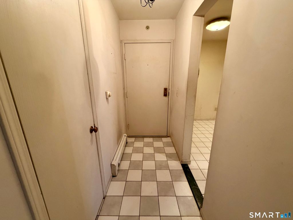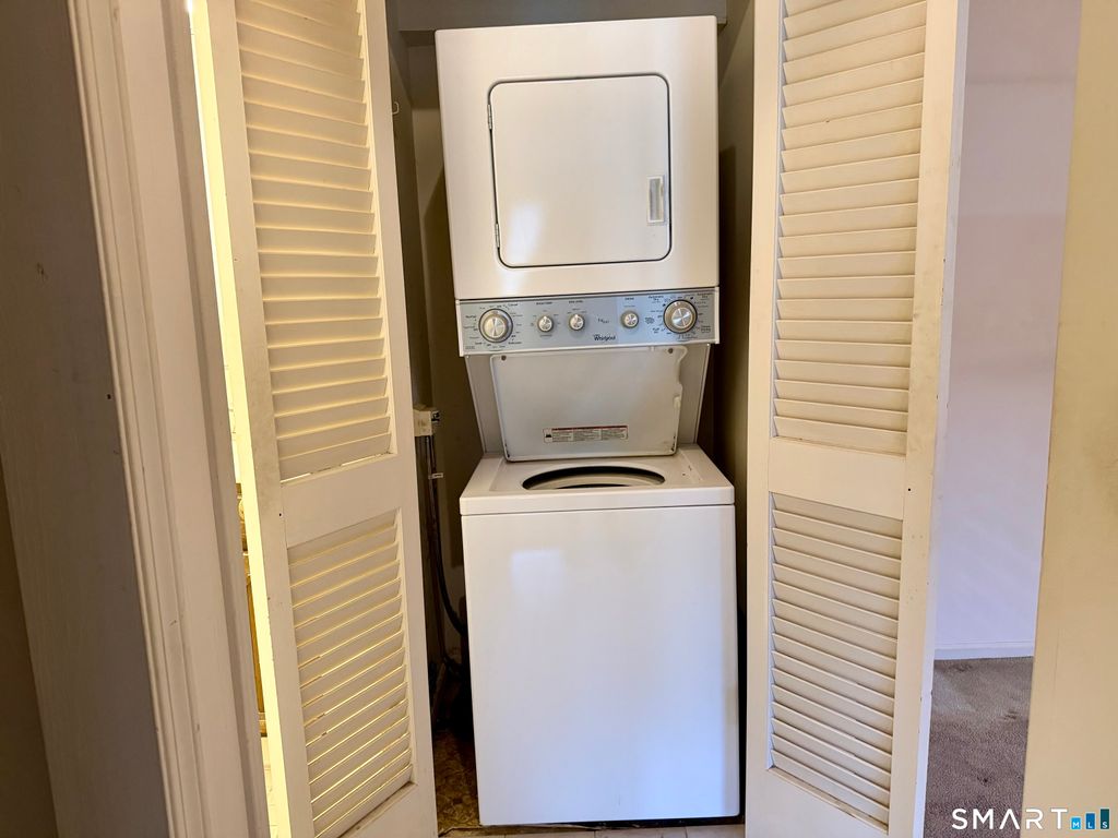 Discover easy living in this well-maintained Stratford complex, perfectly situated for commuters near the Merritt Parkway and Route 8. This second-floor unit features a spacious living room and dining room that opens to a private covered deck, ideal for relaxing outdoors. The functional layout includes a galley kitchen, and a large primary bedroom complete with a walk-in closet. For ultimate convenience, find a stackable washer and dryer tucked into a closet and a linen closet adjacent to the bedroom. This unit also provides additional private storage in the basement. Monthly common charges conveniently include both heat and hot water. Residents can enjoy the complex pool and close proximity to local shopping and dining. Whether you are starting out, downsizing, or seeking a solid investment, this unit offers incredible potential in a secure building.