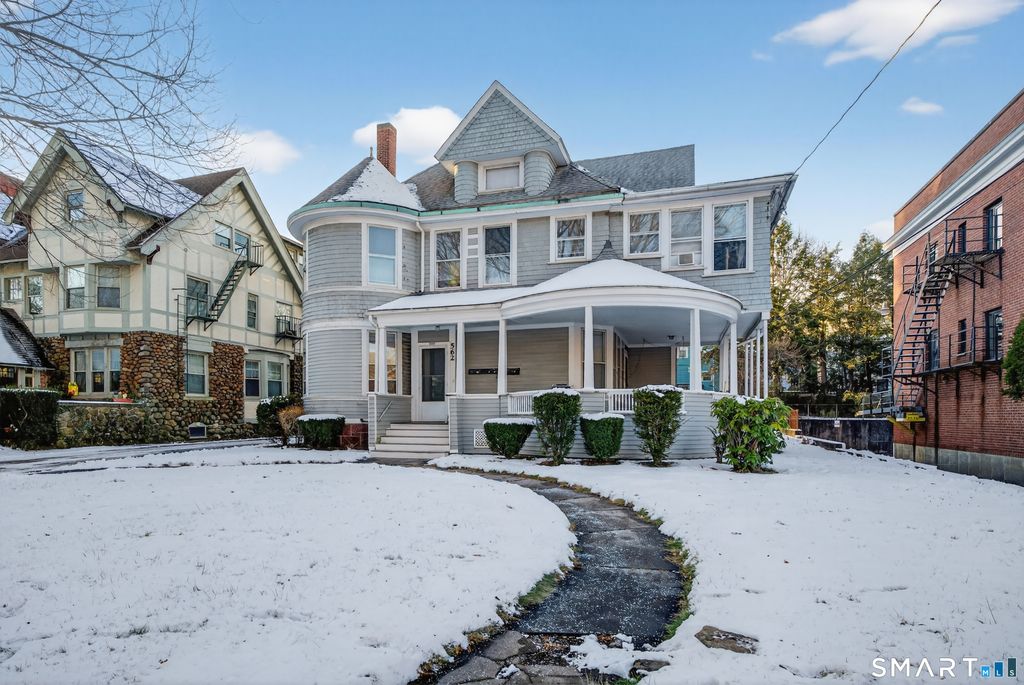 Stately 4226 SQ FT 4 family building in the heart of the East Rock with a wrap around porch, perfect for an owner occupant or as an investment property. Amazing location steps to East Rock Park, Yale Shuttle & Public Bus stop, and in the Worthington Hooker School District. Very spacious first floor unit has refinished hardwood floors and high ceilings. The living room has a fireplace and bowed window, and a remodeled kitchen has granite counters and a dishwasher. There are 2 large bedrooms and a large bathroom. The second floor unit has two spacious one bedroom apartments, both with high ceilings, hardwood floors, small eat in kitchens, and tile baths. The third floor is a spacious 1 bed, 1 bath apartment with a large carpeted living room, huge bedroom with a skylight, eat in kitchen with dishwasher and tiled bathroom. Huge basement with coin op laundry and storage space. All apartments have separate utilities (gas heat & hot water and electricity). Rare two car garage and 4 additional parking spaces.