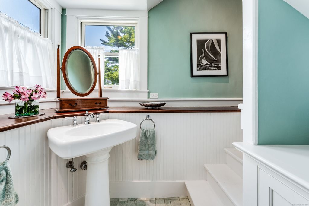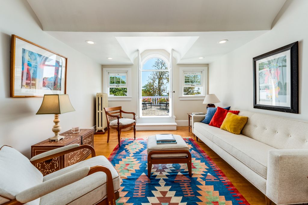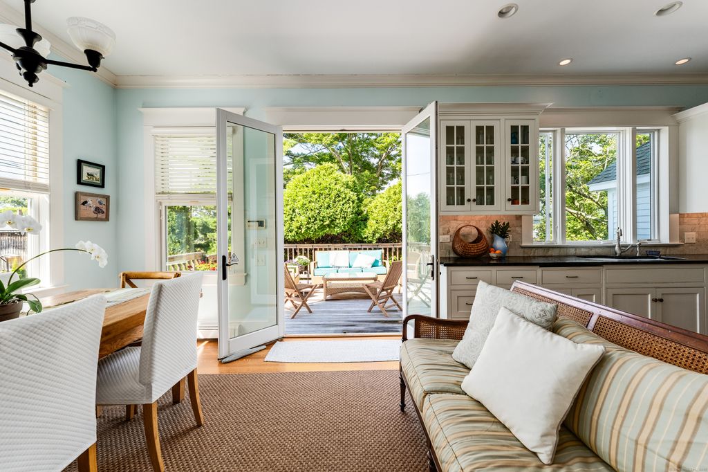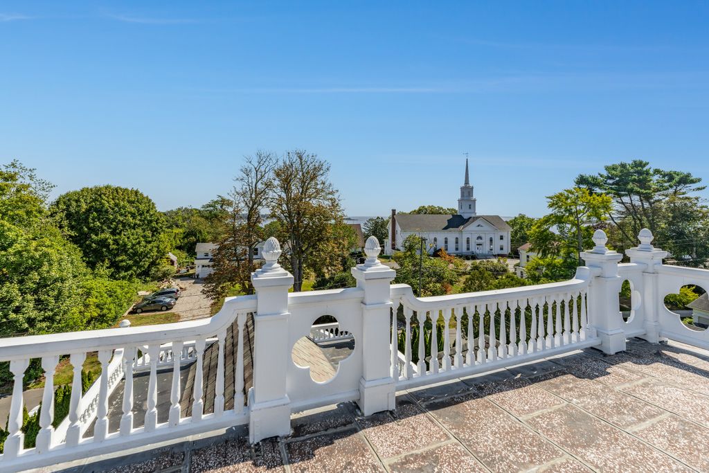 Welcome to the quaint village of Noank, rooted in maritime history and bustling with friendly walkers, bicyclists and boaters. Located just uphill from the water, this exquisite 4,500+ sq ft residence, originally owned by a prominent shipbuilding family, has been wonderfully preserved and beautifully updated. A columned entrance welcomes you into a home rich with architectural details, including stained-glass windows, decorative moldings, and high ceilings. The main floor is designed for both gracious entertaining and everyday comfort, featuring a large living room with a fireplace, an inviting music room/library, and a formal dining room. A spacious, light-filled gourmet kitchen connects to a charming butler's pantry with extra oven and bar sink & fridge, and double back doors open to the deck for outdoor entertaining. Upstairs, the second-floor hosts two generous ensuite bedrooms, a versatile family room, an office, and a laundry room. The third floor includes additional ensuite bedrooms, a bright sitting room, and access to a classic widow's walk - perfect for taking in views. Walk to restaurants, parks, beaches, marinas and more. Close to downtown Mystic and RI Beaches. Easy access to both NY and Boston. Plans for a garage being made presently. Make your appointment to view this property today.