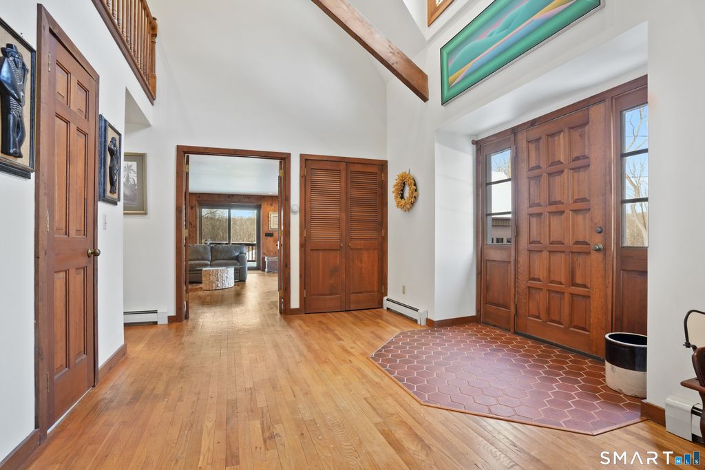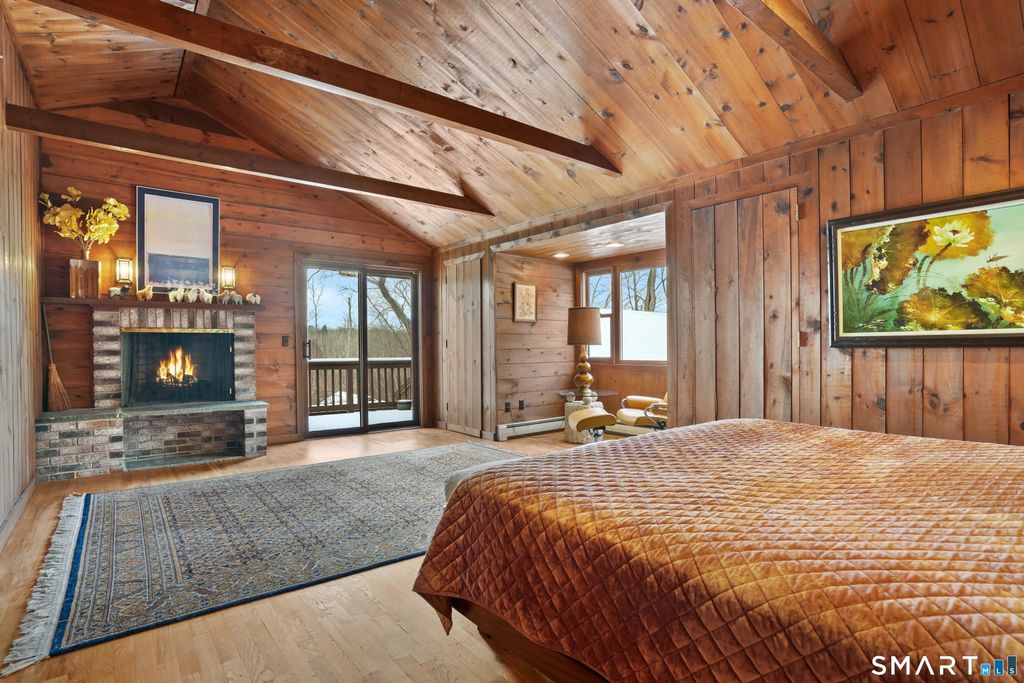 An Iconic Carriage Barn Conversion like this seldom comes on the market. This is only the second owner since the original Carriage Barn was thoughtfully converted, preserving the distinctive architecture of the early 1900s while reimagining the space in 1977 Step inside the light-filled, two-story foyer with soaring 21-foot beamed ceilings and a charming balcony. The gracious family room, anchored by a wood-burning fireplace, showcases panoramic views of the grounds and opens to an expansive deck complete with a fieldstone BBQ. The kitchen flows seamlessly into the dining and family rooms, featuring a clever pass-through for effortless entertaining. The front-to-back living room provides generous space for gatherings. Upstairs, the primary suite sets the tone with a cozy fireplace, a large walk-in closet, private bath, and a stylish study nook tucked into an alcove. Step out onto the private deck to savor western views and breathtaking sunsets. Three additional bedrooms and a full bath complete the second floor. Nestled on 3 lush acres abutting deeded conservation land, this property guarantees privacy and includes a detached three-car garage. A true retreat-your own piece of Shangri-La j. Set well back from the road, this residence offers the perfect blend of privacy and convenience-just minutes from the village, shopping, and fine dining.