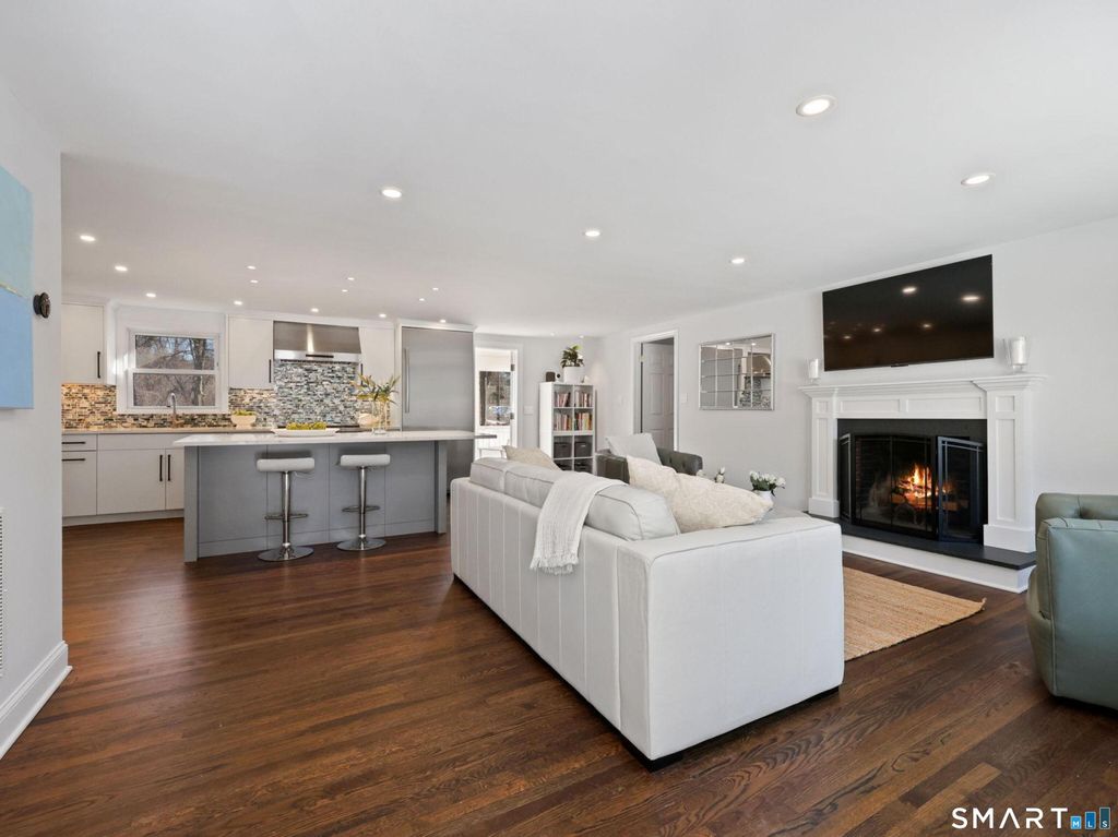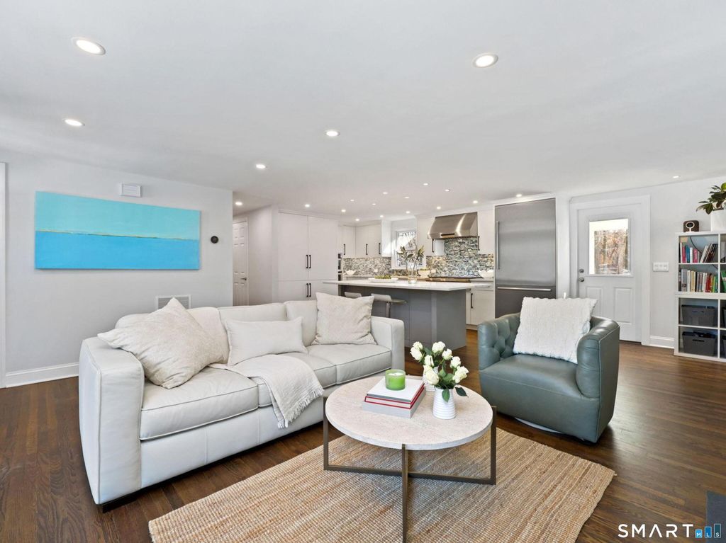 Nestled at the end of a cul-de-sac in Rowayton, Norwalk's beloved coastal village, this beautifully renovated ranch offers easy, turnkey living with room to spread out. Set on 0.46 ac and upgraded top-to-bottom (interior to exterior) through 12/25, the home delivers 2,264 sq ft of updated style, comfort, and modern convenience. Designed for seamless single-level living, the main floor features a refined open layout with hardwood floors, a sunlit living dining area anchored by a cozy fireplace, an upgraded kitchen, three serene bedrooms, two full baths with heated tile floors, and laundry room. The fully finished LL expands the way you live, with a family/playroom, office, gym/bedroom, full bath, storage, and second laundry room, ideal for guests, hobbies, work-from-home, or multi-generational needs. Enjoy the indoor-outdoor flow to a professionally landscaped yard with views of a neighboring pond, perfect for morning coffee and entertaining. Completing the lifestyle, an updated garage with great storage, a he/she shed, and access to all Rowayton's signature amenities, community events, summer concerts, paddle, tennis, pickleball, beach days and boating, winter polar plunges, saunas, arts, dining, and easy Metro-North/I-95 commuting. A rare opportunity for effortless one-floor living with flexible space below, polished, turnkey, and inviting is ready to welcome you to Rowayton's lifestyle.