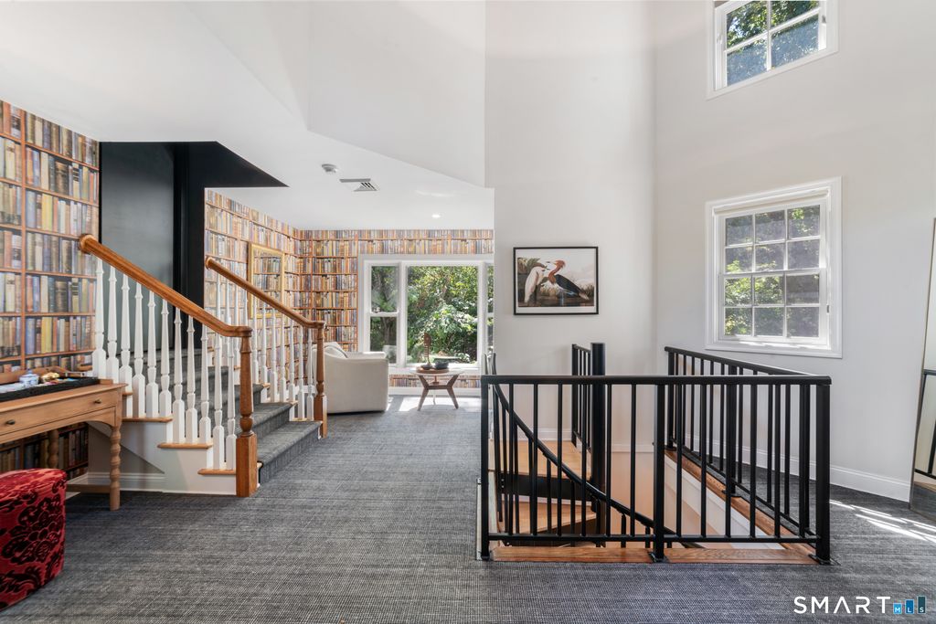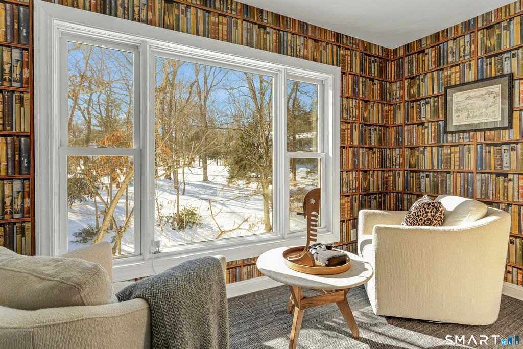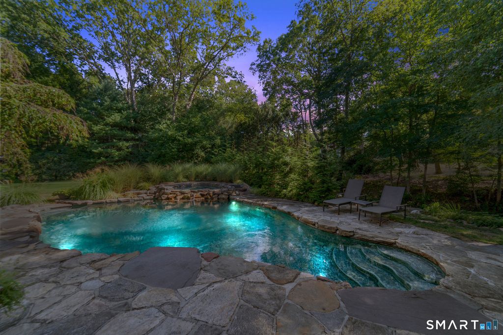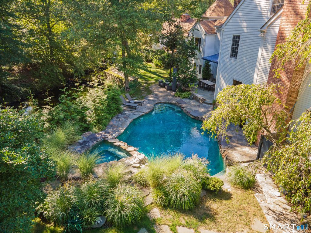 Completely and thoughtfully renovated, this exceptional New Canaan residence blends timeless architecture with refined modern luxury in a magical private setting overlooking the Noroton River and cascading waterfalls. Located on one of New Canaan's most coveted Westside streets, the home enjoys a close-knit neighborhood known for friendly gatherings and neighborhood parties. The heart of the home is a chef's kitchen with Viking appliances, custom white oak island and pantry, and Mont Blanc quartz countertops. Designer finishes include newly renovated baths, a recycled glass and concrete bar top, imported European wallpaper murals, and Restoration Hardware lighting. Architectural details such as hidden bookcase doors, refinished wood floors, and a dramatic slide-and-stack door system create seamless indoor-outdoor living filled with natural light.The main residence offers soaring ceilings, four fireplaces, a sun-filled library, expansive primary suite, three additional bedrooms, office, and a finished lower level with recreation room and gym. In addition to the main residence, this unique home features a separate yet attached two-bedroom, two-bath guest, au-pair or in-law suite, and its own living, dining, and eat-in kitchen. Outdoors,enjoy a heated Gunite pool, professionally landscaped grounds, and tranquil river views. New roof, Generac generator, and updated mechanicals provide peace of mind. This serene retreat offers an exceptional New Canaan lifestyle