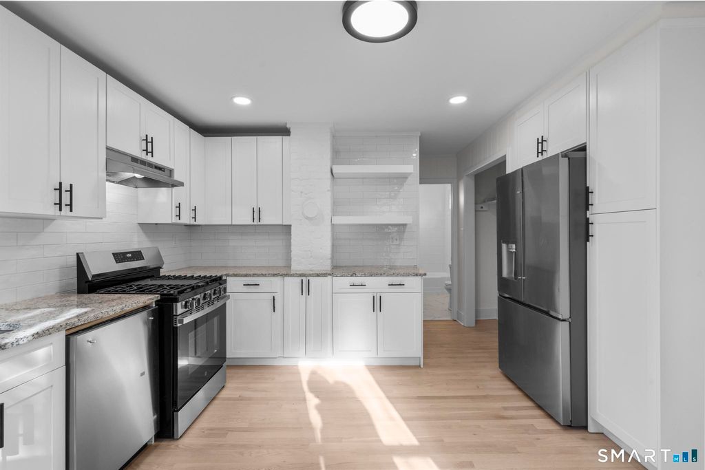 NEWLY RENOVATED! Come home to this beautifully-restored Colonial, exuding vintage charm with modern finishes! Step through the main entryway into a bright, well-appointed chef's kitchen, fully updated with speckled granite countertops, subway tile backsplash & shaker cabinetry. Enjoy cooking for company with a gas range & stainless steel GE & LG appliances. Exposed brick & custom built-in shelving complete the home's character. Refinished original hardwood floors & 9ft ceilings tie together elevate the main level. Spend the holidays in a spacious living room w/ a cozy wood-fired stove & huge front bay windows. Off the kitchen, a functional full bathroom with matte black contemporary fixtures, and a formal sit-in dining room. Upstairs, find three large bedrooms, including a primary bedroom flooded with warm sunlight & a private en-suite bathroom. Another set of bay windows make for a perfect reading nook w/ views of Castle Craig in the distance. Walk-up attic & full basement for plenty of extra storage. Plenty of shaded, private outdoor space for entertaining or gardening. Enjoy a central location close to shopping, restaurants, and easily commutable to Hartford, Middletown, and New Haven. Extensive list of upgrades include vinyl replacement windows, a newer roof & siding, new doors, new trim, & much more. This home is truly turn-key - set up your internet provider, move your belongings in, and start enjoying it immediately. Come see it today!