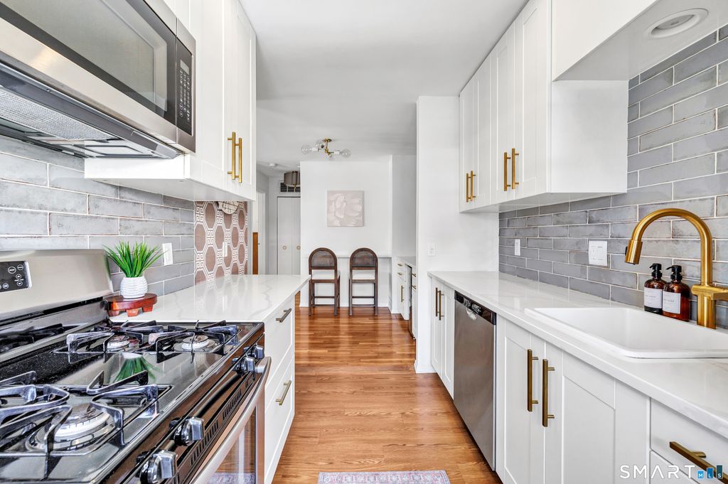 Stunning 1 bedroom 1 bath home offering just under 1000 sqft of living space in sought after Mosswood Condominiums! A stylish entrance featuring a custom runner & modern banister welcomes you into this beautifully updated home. The open-concept living/dining areas flow seamlessly into an eat-in kitchen, perfect for everyday living & entertaining! The renovated kitchen boasts white cabinetry, brass hardware, white quartz countertops, an eat-in "breakfast bar" & additional cabinetry area with floating shelves & a beverage cooler. AMAZING custom wall coverings in kitchen & bath. Hardwood floors & updated lighting thru-out, complemented by large windows that flood the space with natural light. The spacious primary bedroom features hardwood floors & a walk-in closet. The full bath features white vanity, white counters, brass hardware & a combination tub/shower. In unit washer & dryer. A deck off the main living area allows you your own private access to the outdoors. Central air & Natural gas. Storage unit in building. Quiet location in complex with private entrance & parking. Ideally located within walking distance to town, train, beach, restaurants & shopping. A must-see property offering comfort, style & convenience.