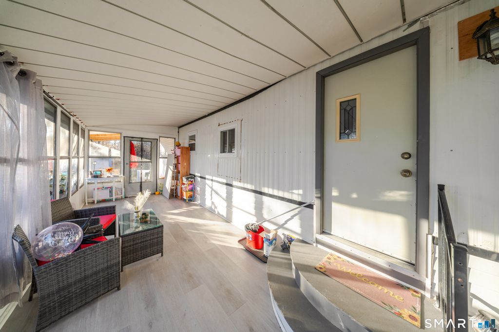 Located in a wonderful, private mobile home community, this updated, turnkey home stands out by offering more outdoor space, greater separation, and modern upgrades than many homes in the community. Positioned on a desirable corner lot, it provides added privacy that is rarely found in this setting. Inside, the bright, open floor plan features fresh paint throughout, new kitchen cabinets, new countertops, a brand-new microwave, and newer stainless steel appliances. The bathroom includes a washer/dryer combo unit for added convenience. Two enclosed porches-front and rear-offer versatile bonus space for storage, relaxing, or everyday use. Additional highlights include a private shed, a driveway with parking for up to three vehicles, and low-maintenance living, with HOA fees covering most major expenses. Residents enjoy outstanding amenities including access to a private community hall available to owners for just $50, ideal for hosting gatherings or special events. Also right outside the community there is a public swimming pool, basketball court, tennis court, and more! This is a rare opportunity to own an updated home in East Hartford for under $100,000.