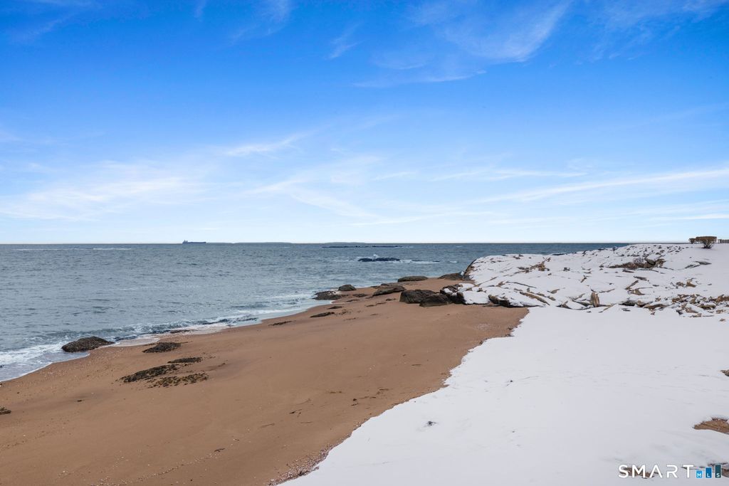 Coastal living meets resort style comfort in this light filled condo set within the desirable Four Beaches community. Perched on the third level with elevator access, this ranch style unit offers sweeping water views, ocean frontage, and an easy, relaxed layout designed for everyday living and entertaining. Hardwood floors flow through the main living spaces, where a cozy fireplace anchors the living room and sliders open to a private deck overlooking the shoreline, perfect for morning coffee or sunset unwinding. The kitchen features granite countertops, tile flooring, and ample cabinetry, connecting seamlessly to the dining and living areas. Two spacious bedrooms include ceiling fans and hardwood floors, with the primary suite offering a walk in closet and private full bath, complemented by a second full bath with a stall shower. Central air, in unit laundry, and an under house garage add everyday convenience. Residents enjoy exceptional amenities including a heated in ground pool, private beach access, tennis courts, clubhouse, and meticulously maintained grounds. Just moments from the sand and Long Island Sound, this home delivers effortless coastal living with a vacation like feel year round.