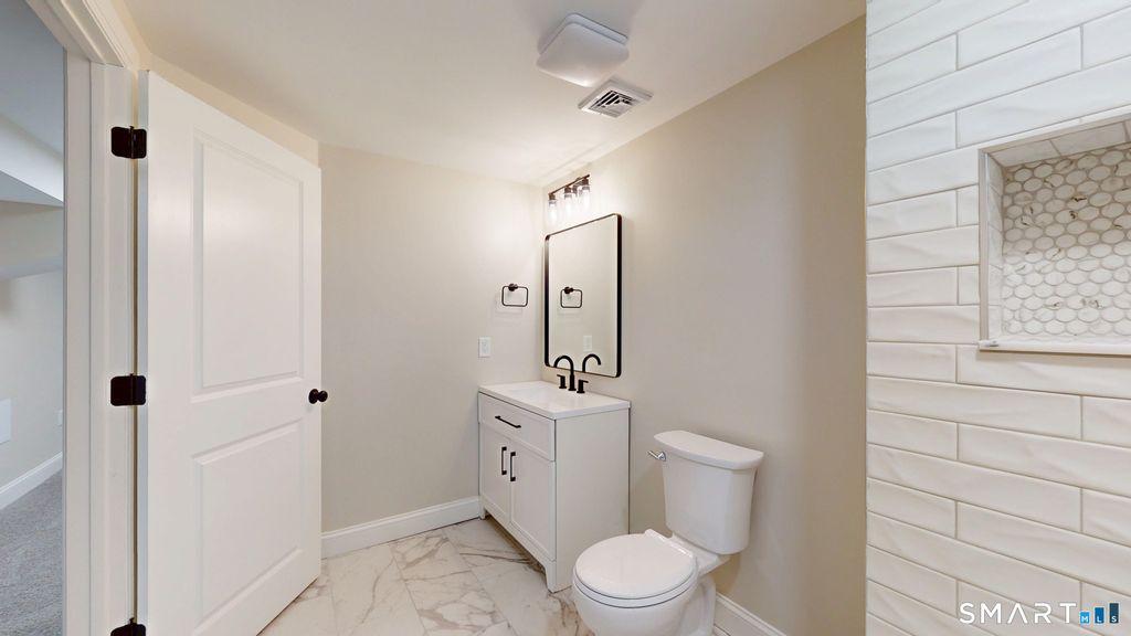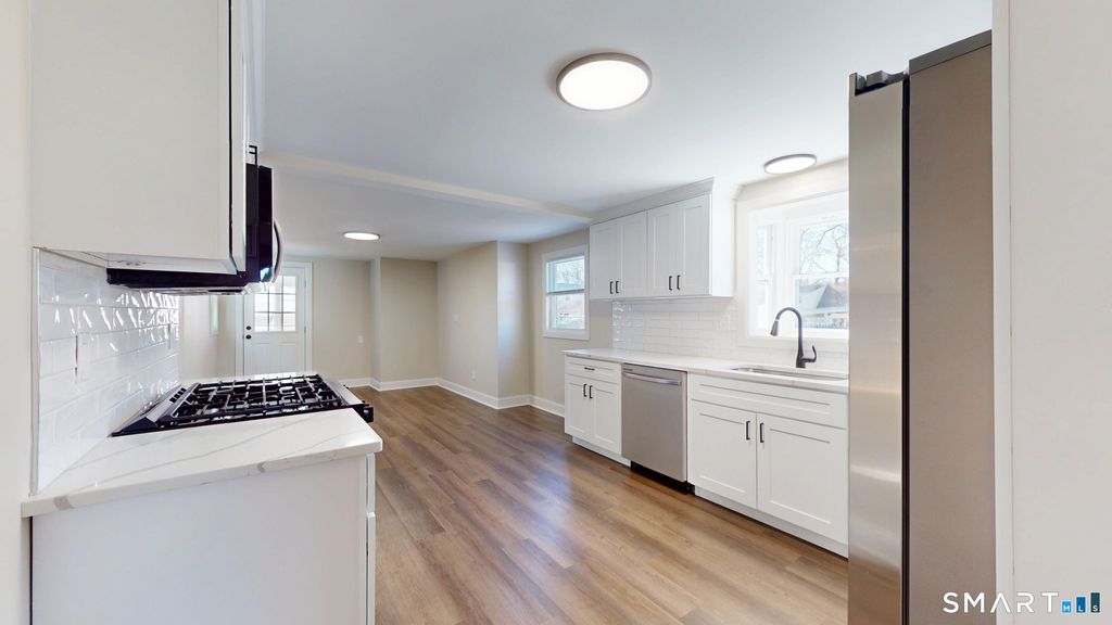 Welcome to this stunning, turnkey 4bd 2.1ba residence in a peaceful, desirable Newington neighborhood - ideally located for convenience and commuting. Enter through the charming enclosed three-season porch and step into a completely transformed home that feels like new construction. The showstopper is the gorgeous, fully renovated kitchen featuring custom shaker cabinets, luxurious quartz countertops, crisp subway tile backsplash, and premium stainless steel appliances. Adjacent flex space is perfect as a private dining room, home office, or even a fourth bedroom for guests/multigenerational living. The spacious living room offers gleaming hardwood floors, a large picture window for abundant natural light, and a stunning fireplace ideal for cozy evenings. A beautifully updated first-floor full bath with custom tile accents provides everyday convenience, while the main-level primary suite boasts an oversized walk-in closet and direct laundry access. The fully finished lower level is a highlight - ideal for a family room, gym, media area, or office. It includes a second full bath with sleek walk-in shower, ample storage, plus brand-new HVAC, water heater, and updated electrical for total peace of mind. Upstairs, two generous bedrooms with plenty of closet space share a convenient half bath. This rare find blends classic charm with modern luxury in one of Newington's best locations. Impeccably updated and truly move-in ready - just unpack and start living your dream!