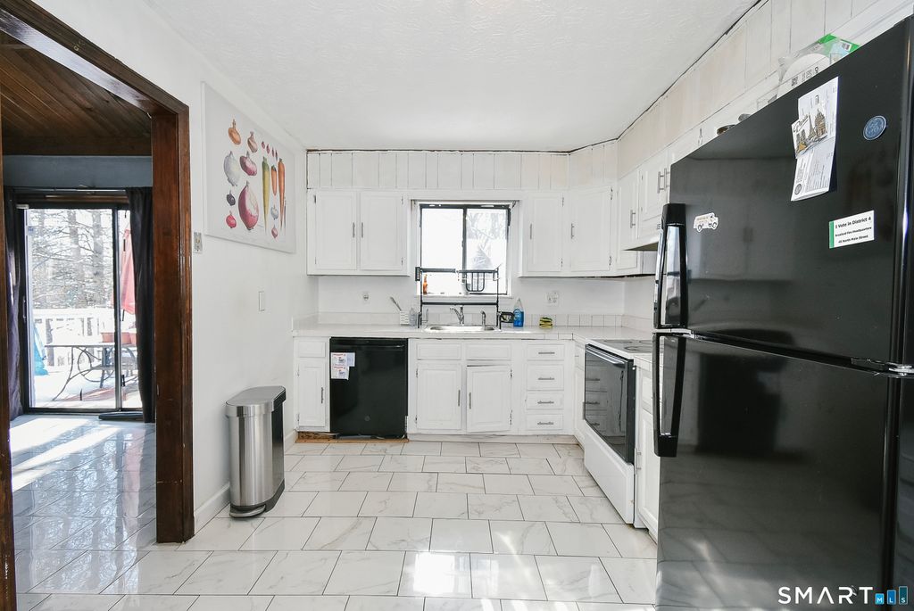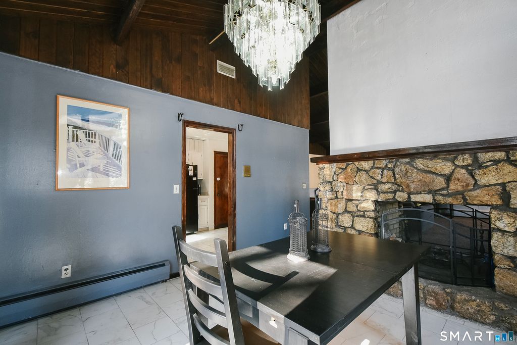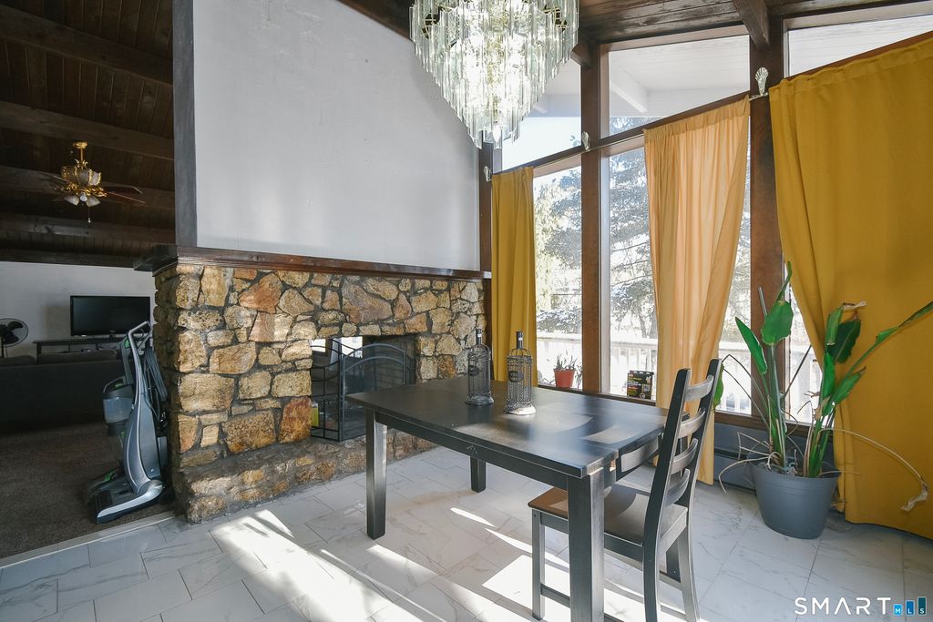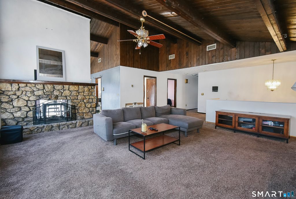 Welcome home to rustic Connecticut charm paired with flexible living space and timeless character. You are greeted by a warm living area featuring exposed wood beams and a beautiful stone fireplace that anchors the space with cozy appeal. Just beyond, your kitchen offers an abundance of cabinetry, giving you ample storage and functionality for everyday living and entertaining. Step outside and enjoy a wraparound porch that spans the front of the home, extends to the kitchen, and picks back up just outside your primary bedroom, creating multiple outdoor spaces to relax and unwind. Your main level includes three bedrooms and one full bathroom. The finished lower level adds incredible versatility with a full kitchen, full bathroom, and additional rooms that offer flexible use, providing potential for an in law style setup or other creative living arrangements. Your primary bedroom features double door walkout access to a private sitting porch overlooking a flat, fenced in yard and a peaceful stream, offering a tranquil setting for morning coffee or quiet evenings. With its distinctive layout, charming architectural details, and serene outdoor space, this home invites you to bring your vision and personal touch to make it truly your own.